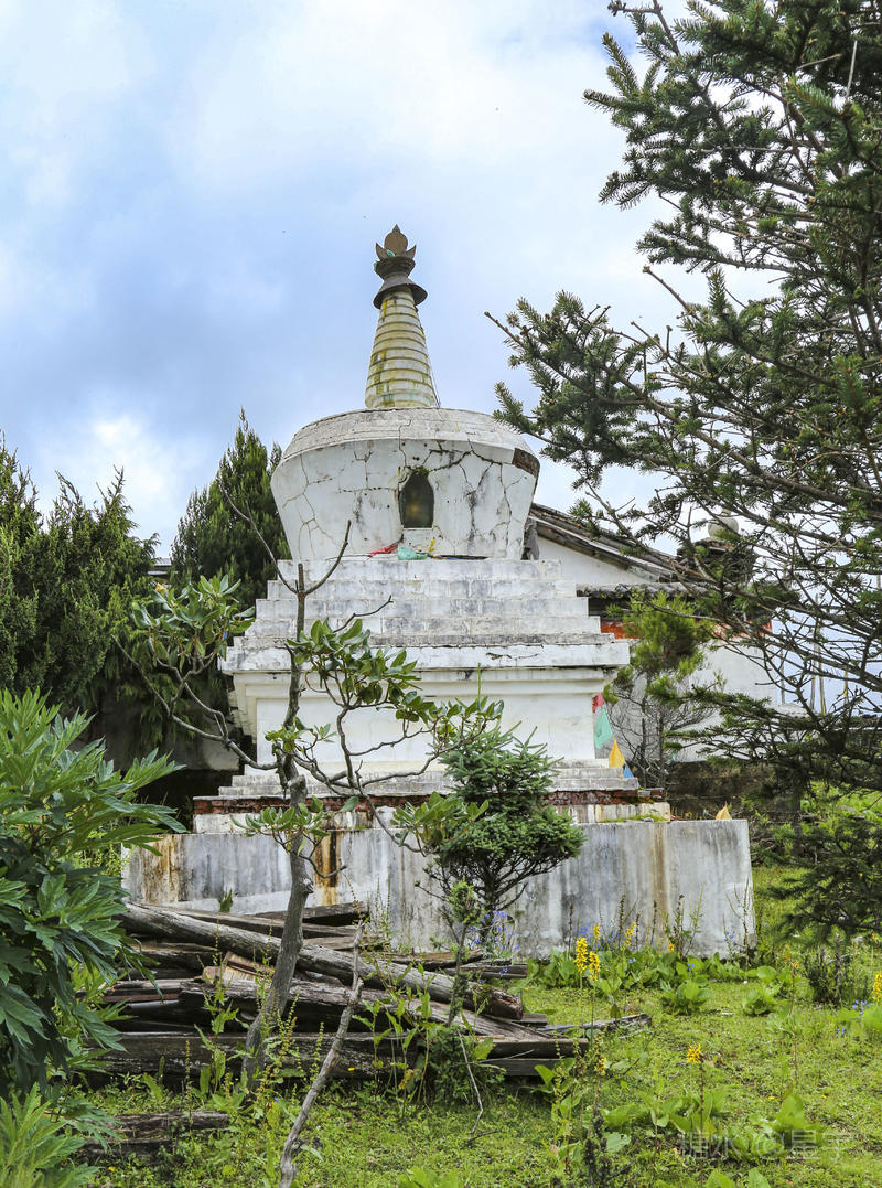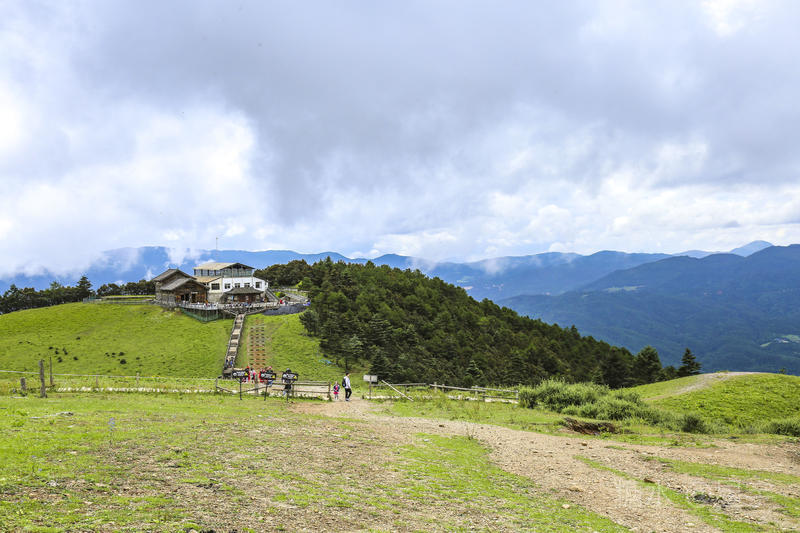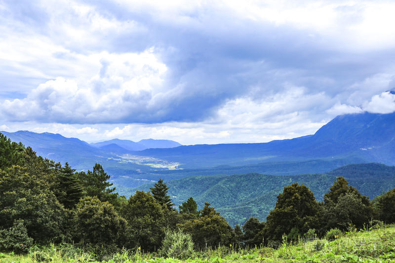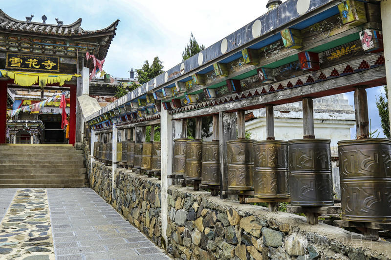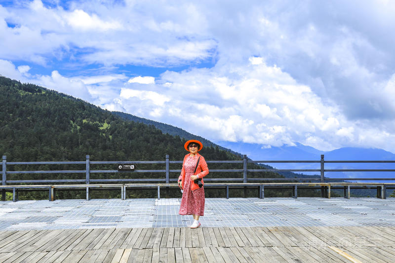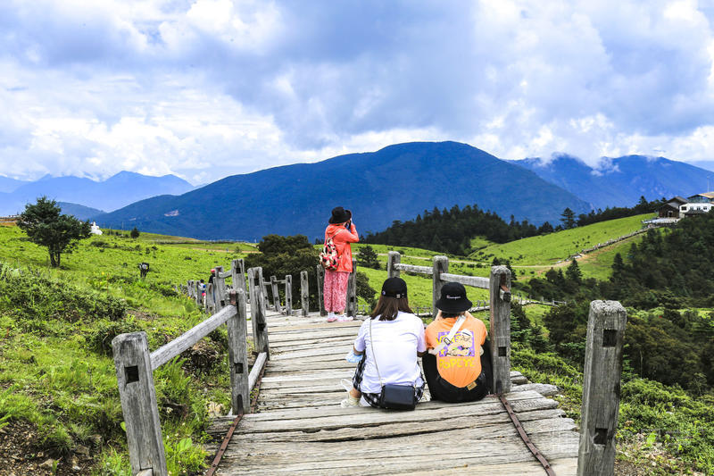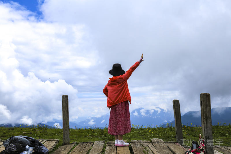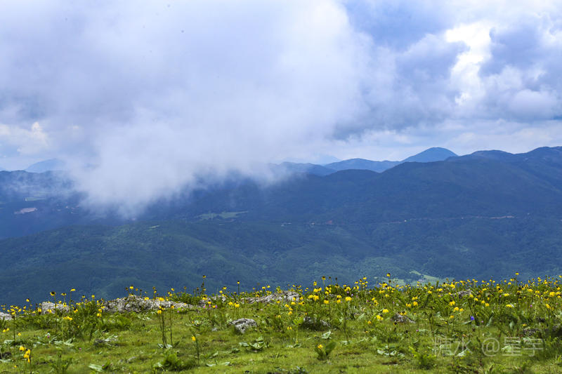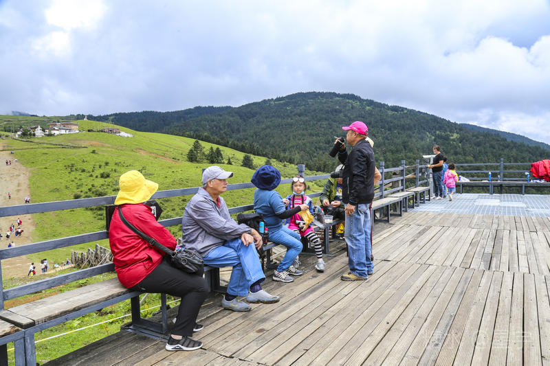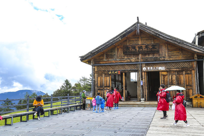 缆车上到一个宽阔的观景台,可以眺望远处的草甸,背后的玉龙雪山,草甸上有一个寺庙,有村民去那里转经。因天气阴沉云层很厚见不到玉龙雪山的全貌。