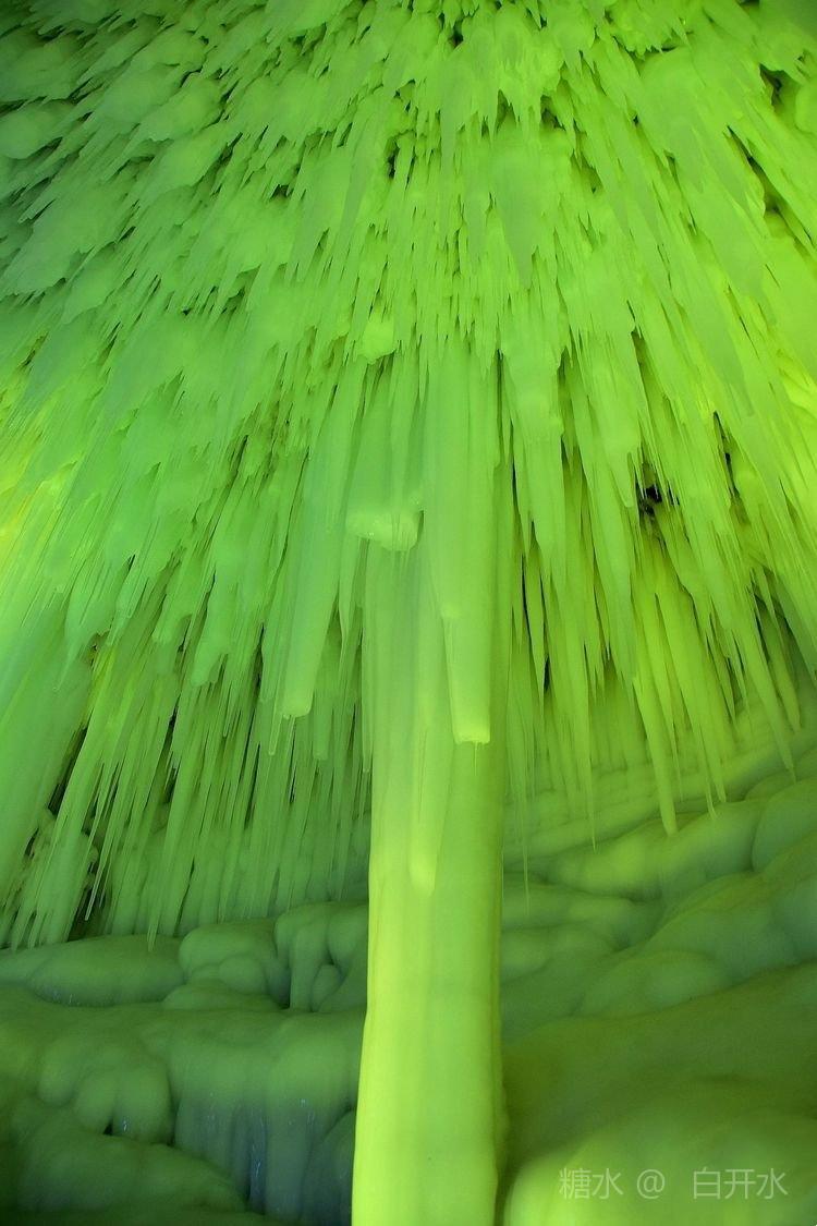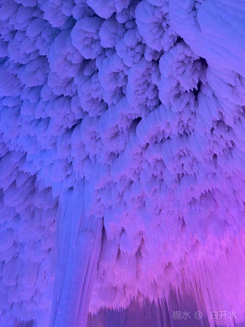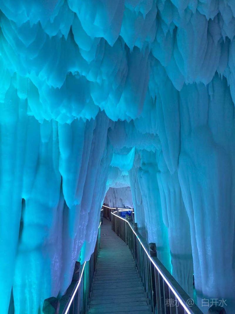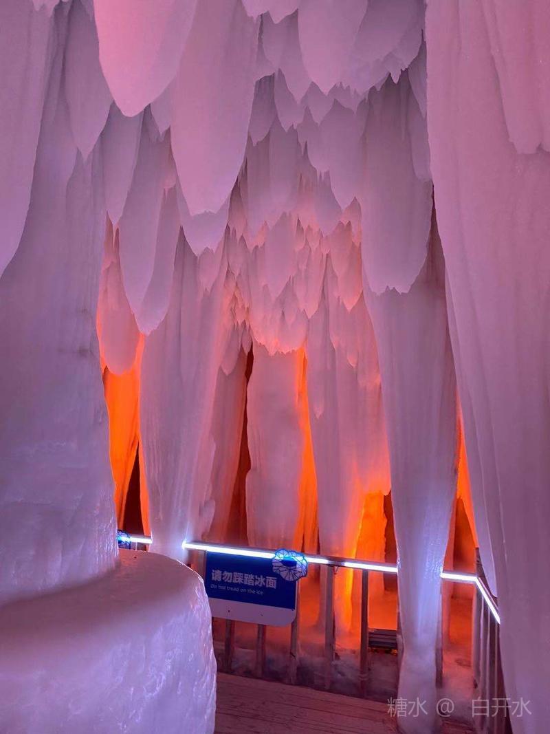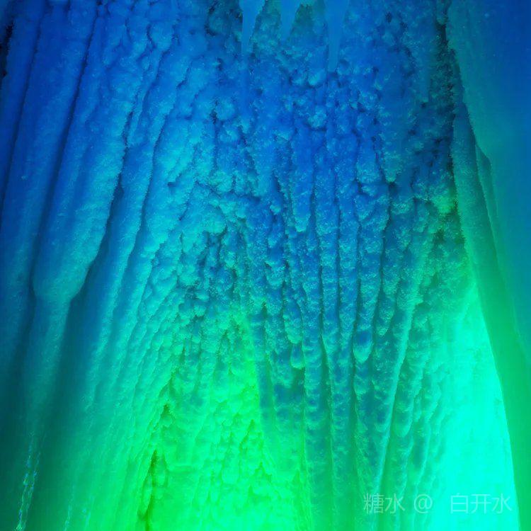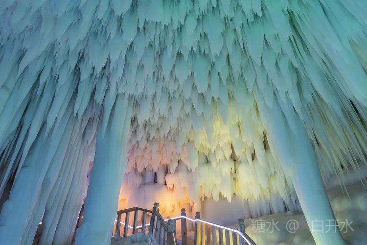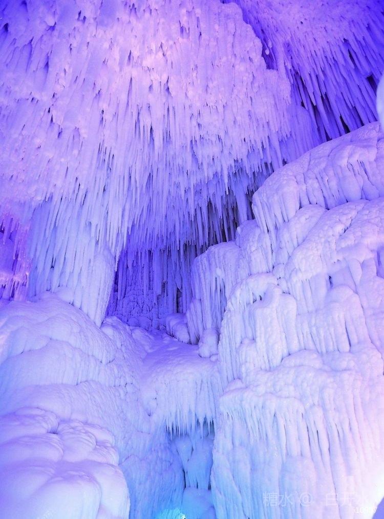 洞中的冰笋、冰柱、冰瀑晶莹剔透,在灯光的照射下呈现出梦幻般的景象。