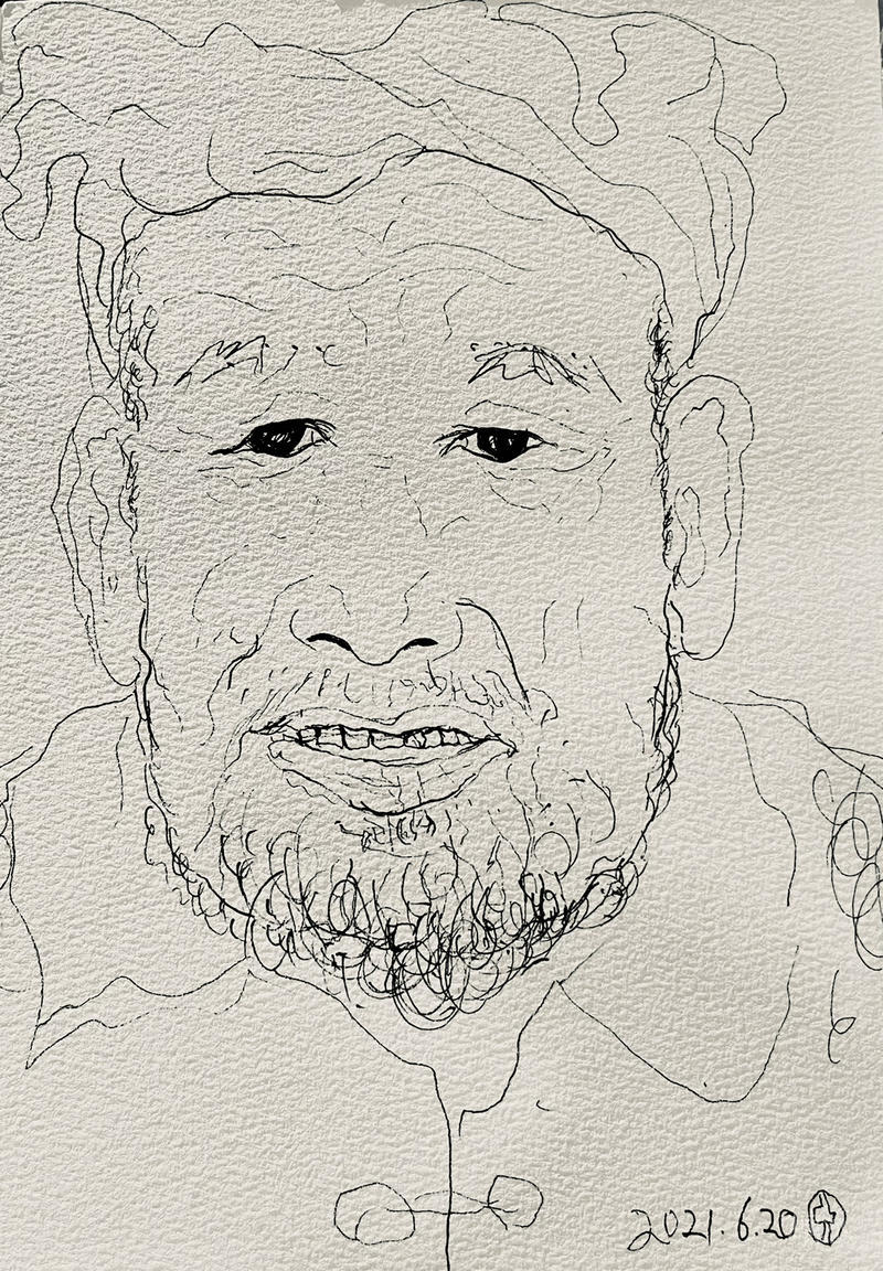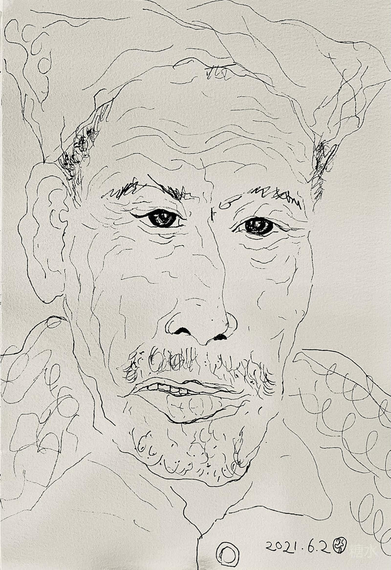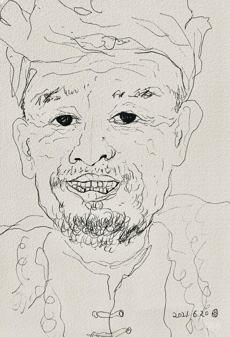 陕北老汉岁月苍桑刻脸堂,皱褶纵横如沟壑。风吹日晒留印记,健康红润古铜色。羊肚手巾戴头上,老旱烟袋缠腰侧。心慈面善乐观人,黄土高坡不老客。