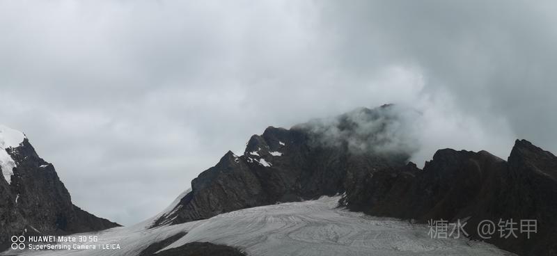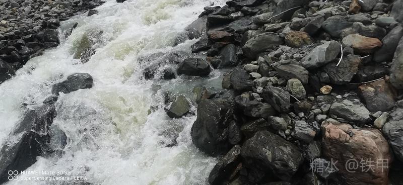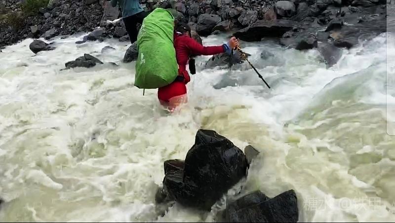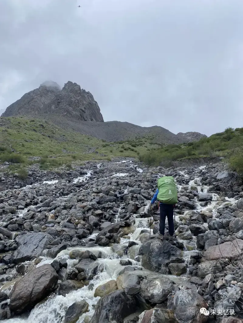 冰川融水形成的河流很凶猛,我们走河南岸,最后无路可走,前面碎石坡坡度有四五十度上上下下折腾了好几趟,没有一个安全地方。溪水湍急搞不好就会被冲走,最后勉强找了个地方,雪水寒冷刺骨,水流太急,水下石头打滑,光脚丫无从下脚,捏着满头汗强行过河,此时小雨也哗哗下个不停,忙中添乱