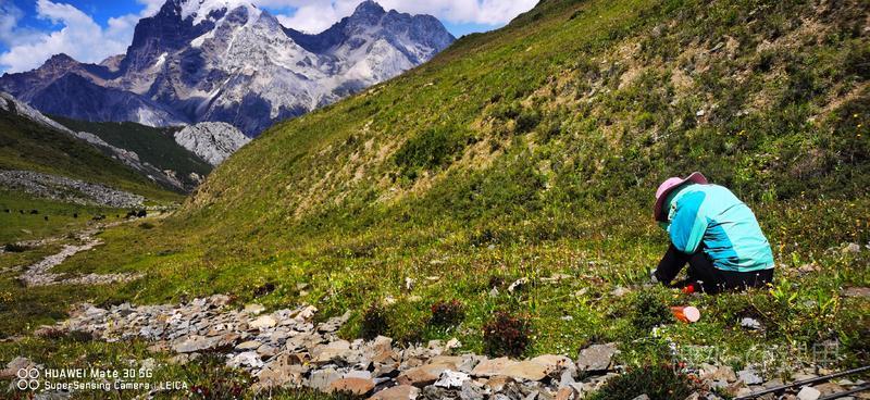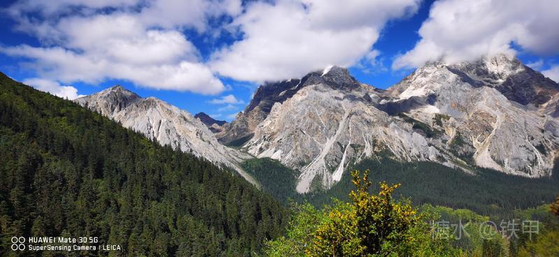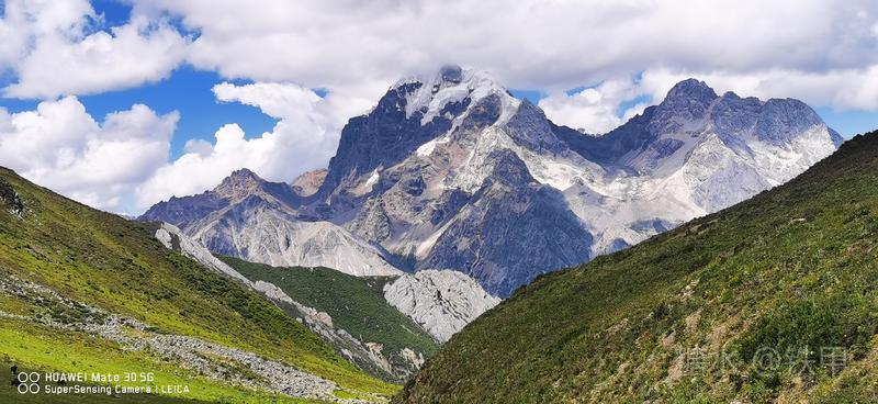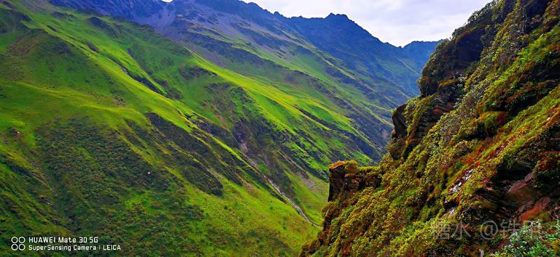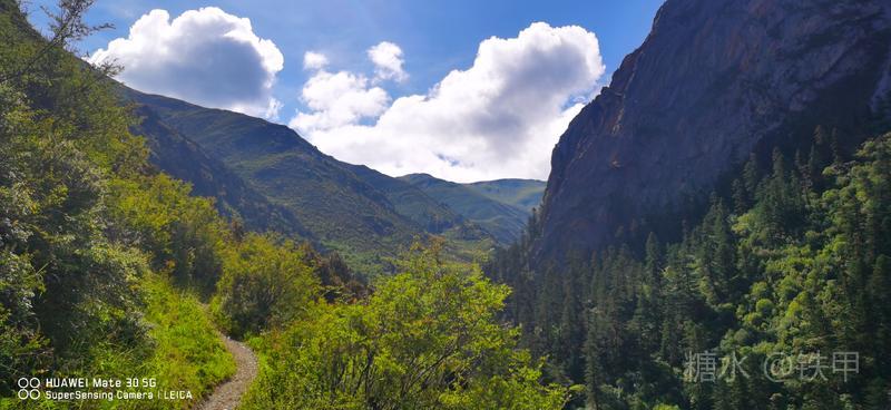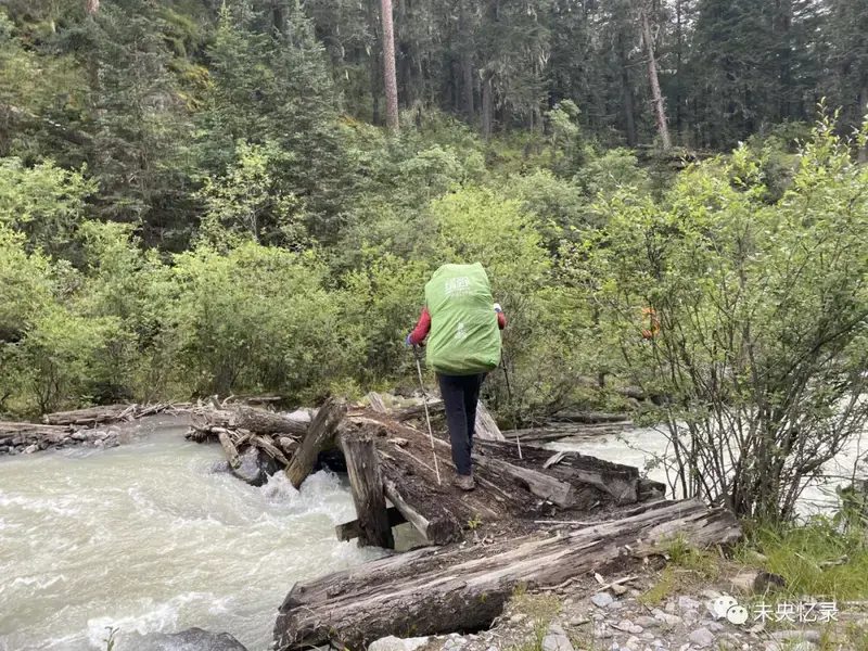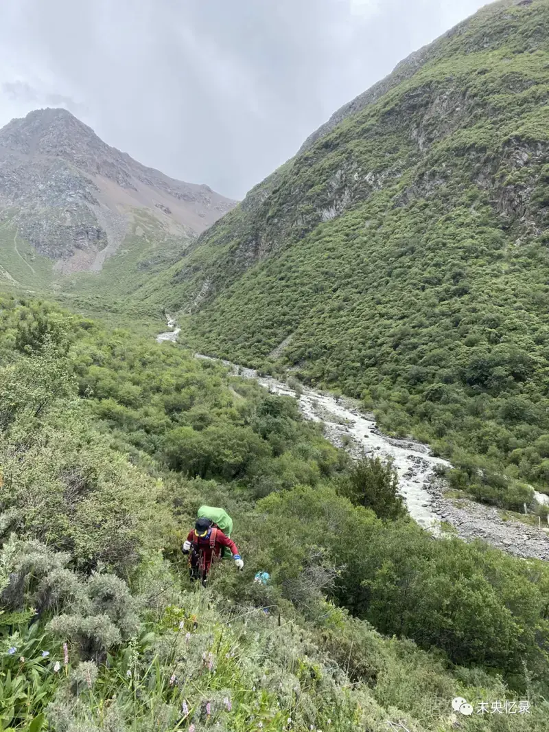 今天从这里开始爬升路很好走,各走各的没人说话只顾赶路,到了艰难的山坡也没人看轨迹,继续蒙头爬啊爬,爬的老王招架不住发脾气,干嘛呢这么拼命,原地休息几分钟抓紧晒装备,打开轨迹发现爬错山了,然后顺着树林直下爬着、跪着硬干到沟底,前面一几百米就能看到身后的央莫龙雪山偷看着我们笑话,一路相随。
