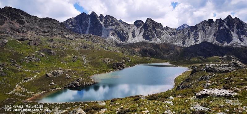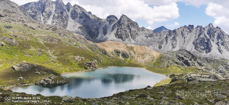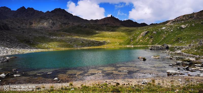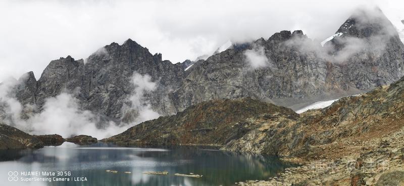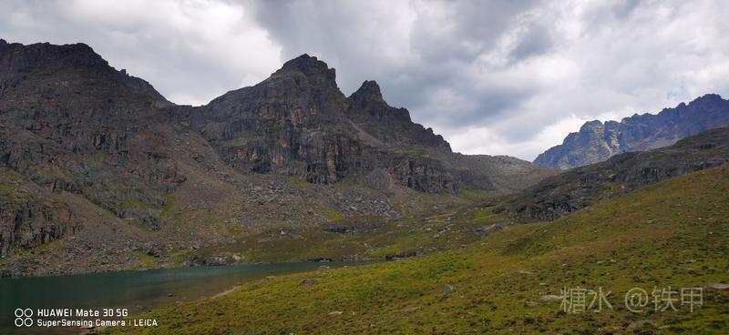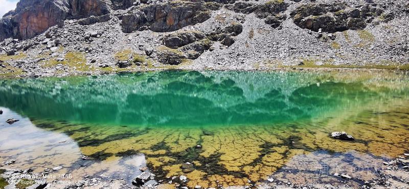 下到相丘曲格旁,随后沿着海子东岸的崖壁横切,再往上攀几米,小心一点是没多大问题的。随着视角的变换,相丘曲格措的颜色变得更加漂亮。