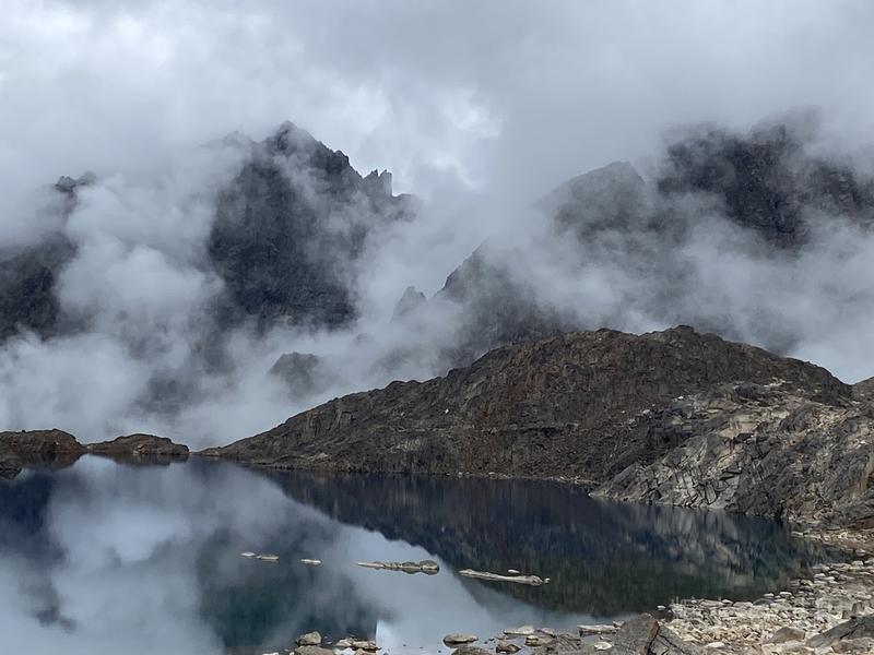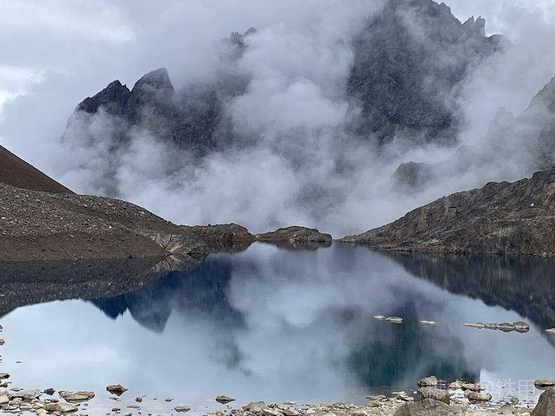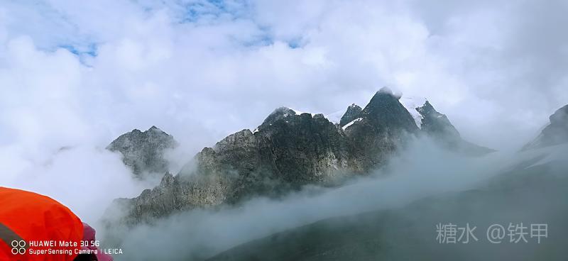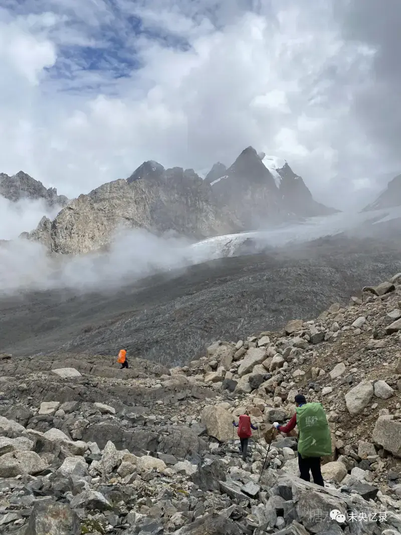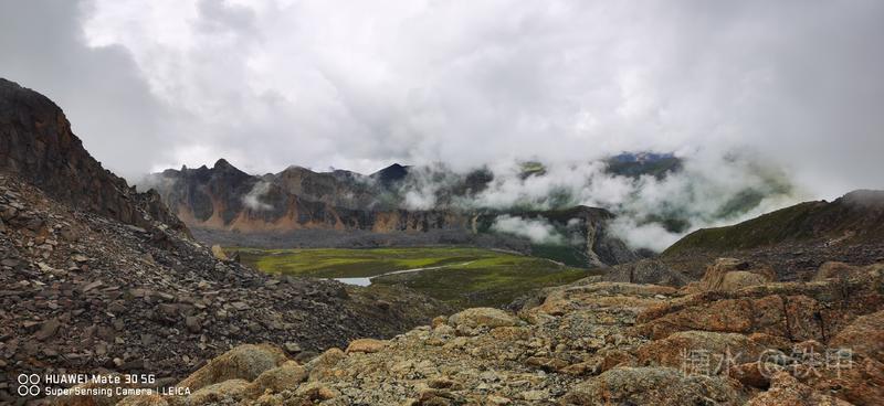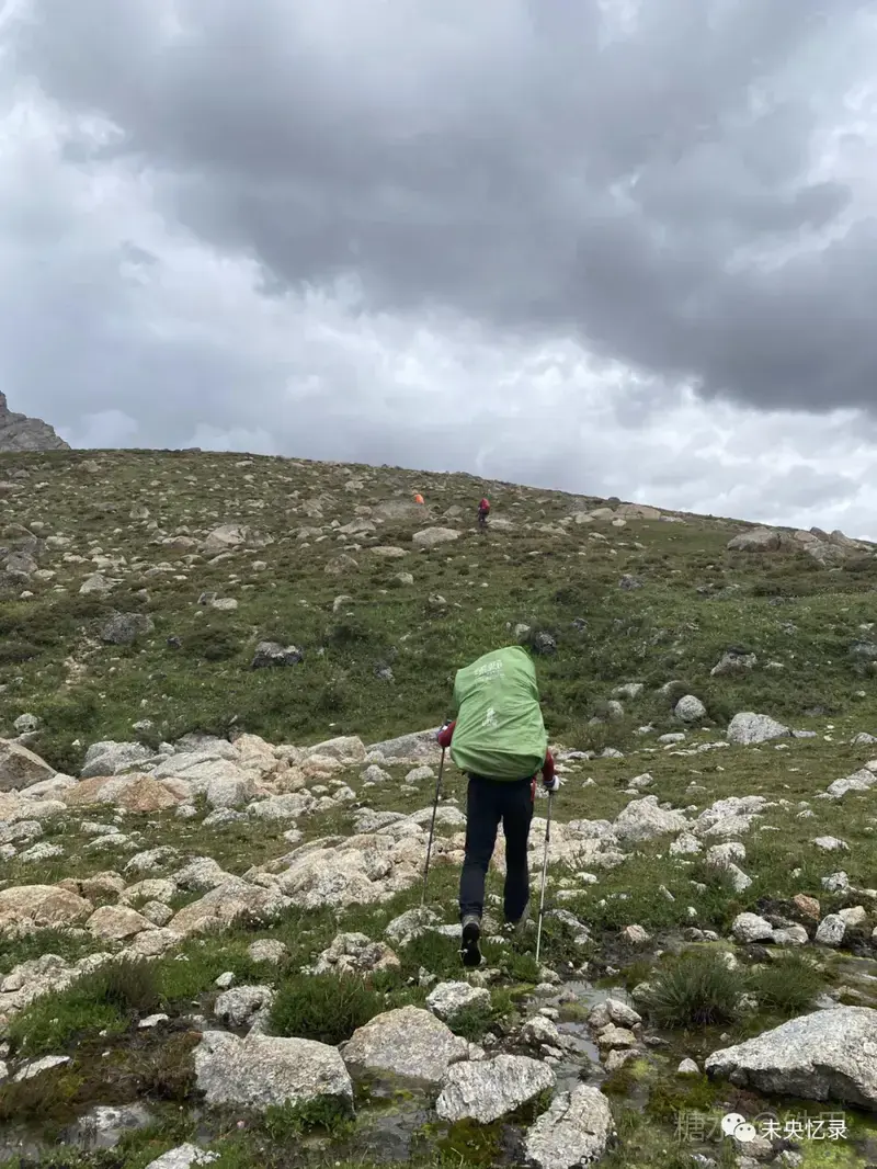 下到沟底沿着沟底直上,到了中午简单吃点东西继续爬升另一个垭口,轨迹不太明显朝着大的方向前行自由发挥,翻上了第一座山休息一下开始翻越第二坐山时,黑压压的层云压着过来,接着开始下雨,后面的碎石山一眼望不到边,确定扎营