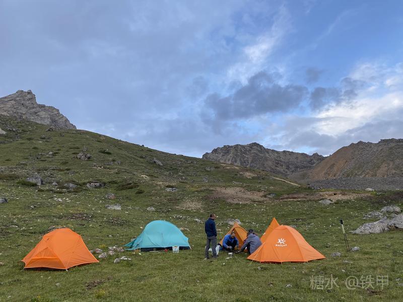 D5 : 4800 -5060-3800营地平坦,小雨了四五个小时,高海拔营地 睡眠不佳,翻来翻去,出现几次不明野兽恐吓,我们在帐篷大声喊叫,哗啦啦一声跑掉,之前经过晚上扎营观察,这么高海拔不可能有牦牛和马,一路也没发现别的动物,早晨起来大家异议估计是马群;未央晚上扎营遇见鬼,一直听见耳边气喘吁吁的声音,吓的一直喊叫,我们几个怎么听也没动静,吓的实在不行钟天起来侦查一圈确定没有怪物,返回帐篷未央还说还有声音出气,吓的逃出帐篷钻别人帐篷避险保安全,我判断有鬼,哈哈……