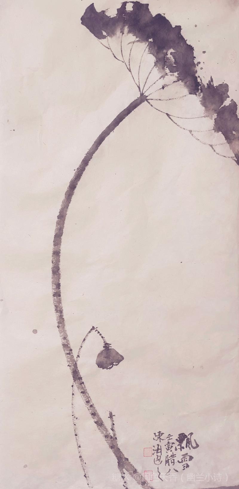 海纳百川作品(陈海)飘雪 关于荷,他观察仔细,静态的荷、风中的荷、雨中的荷、雪中的荷,都力求表达准确到位,当然,大哥用的纸也很讲究,水墨大写意不好表现,需要很高功力,功夫在画外,这跟海纳百川大哥多年古典文学的积淀有很大关系,写着写着咋像写画评了? 说说游龙大哥吧!他以前也画画,写字。画竹、画荷、画兰等,画画、停停