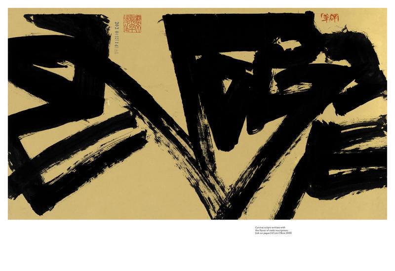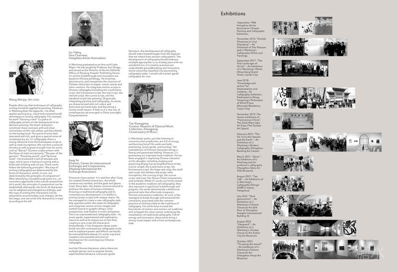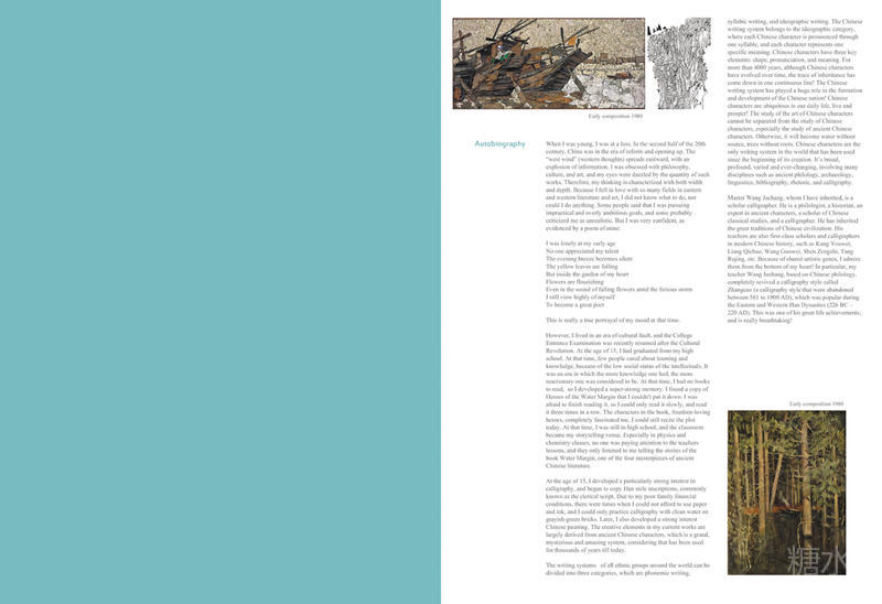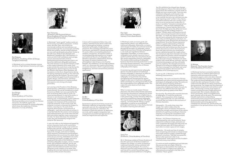 Autobiography and Preface When I was young, I was at a loss. In the second half of the 20th century, China was in the era of reform and opening up. The “west wind” (western thoughts) spreads eastward, with an explosion of information. I was obsessed with philosophy, culture, and art, and my eyes were dazzled by the quantity of such works. Therefore, my thinking is characterized with both width and depth. Because I fell in love with so many fields in eastern and western literature and art, I did not know what to do, nor could I do anything. Some people say that I was pursuing impractical and overly ambitious goals, and some probably criticized me as unrealistic. But I was very confident, as evidenced by a poem of mine: I was lonely at an early age No one appreciated my talent The evening breeze becomes silent The yellow leaves are falling But inside the garden of my heart Flowers are flourishing Even in the sound of falling flowers amid the furious storm I still view highly of myself To become a great poet This is really a true portrayal of my mood at that time. It may be slightly exaggerated, and more importantly, it is imbued with the romantic spirit. However, I lived in an era of cultural fault, and the College Entrance Examination was recently resumed after the Cultural Revolution. Everything is waiting to be improved. At the age of 15, I had graduated from my high school. At that time, few people cared about learning and knowledge, because of the low social status of the intellectuals. It was an era in which the more knowledge one had, the more reactionary one was considered to be. At that time, because I was a virtually a blank slate at the intellectual level and had no books to read, I had developed super-strong memory. I found a copy of Heroes of the Water Margin that I couldn't put it down. I was afraid to finish reading it, so I could only read it slowly, and read it three times in a row. I was completely convinced by the characters in the book with their righteous, freedom-loving, and heroic spirit. The plot of the 500-page book is actually connected in my mind and can be recited aloud. At that time, I was still in high school, and the classroom became my storytelling venue. Especially in physics and chemistry classes, no one was paying attention to the teachers lessons, and they only listened to me telling the stories of in the book Water Margin. Fortunately, this book is one of the four masterpieces of ancient Chinese literature. At the age of 15, I developed a particularly strong interest in calligraphy, and began to copy Han stele inscriptions, commonly known as the clerical script. Due to my poor family financial conditions, there were times when I could not afford to use paper and ink, and I could only practice calligraphy with clean water on grayish-green bricks. Later, I also developed a strong interest Chinese painting. The creative elements in my current works are largely derived from ancient Chinese characters, which is a grand and mysterious system. The development stages are all well connected, and each has its own distinctive characteristics. The Chinese writing system has been used for thousands of years till today, and this is really amazing. The writing systems of all ethnic groups around the world can be divided into three categories, which are phonemic writing, syllabic writing, and ideographic writing. The Chinese writing system belongs to the ideographic category, where each Chinese character is pronounced through one syllable, and each character represents one specific meaning. Chinese characters have three key elements: shape, pronunciation, and meaning. For more than 4000 years, although Chinese characters have evolved over time, the trace of inheritance has come down in one continuous line! The Chinese writing system has played a huge role in the formation and development of the Chinese nation! Chinese characters are ubiquitous in our daily life, live and prosper! The study of the art of Chinese characters cannot be separated from the study of Chinese characters, especially the study of ancient Chinese characters. Otherwise, it will become water without source, trees without roots. Chinese characters are the only writing system in the world that has been used since the beginning of its creation. She is broad, profound, varied and ever-changing, involving many disciplines such as ancient philology, archaeology, linguistics, bibliography, rhetoric, and calligraphy. Mr. Wang Juchang, whom I have inherited, is a scholar calligrapher. He is a philologist, a historian, an expert in ancient characters, a scholar of Chinese classical studies, and a calligrapher. He has inherited the great traditions of Chinese civilization. His teachers are also first-class scholars and calligraphers in modern Chinese history, such as Kang Youwei, Liang Qichao, Wang Guowei, Shen Zengzhi, Tang Rujing, etc. Because of shared artistic genes, I admire them from the bottom of my heart! In particular, my teacher Wang Juchang, based on Chinese philology, completely revived a calligraphy style called Zhangcao (a calligraphy style that were abandoned between 581 to 1900 AD), which was popular during the Eastern and Western Han Dynasties (226 BC – 220 AD). This was one of his great life achievements, and is really breathtaking! I learned from Mr. Wang Juchang and sincerely followed his teachings. I started my learning with “Shuo Wen Jie Zi”, a dictionary compiled by Xu Shen, a scholar of the Han Dynasty, and I intended to delve into the tradition with the guidance of my teacher. I have studied Zhangcao, oracle bone script, bronze vessel script, great seal, small seal, bamboo slip script, stele inscriptions, standard script, running script, and cursive script. During my study, I paid special attention to the archaeological materials unearthed during the past hundred years. I indulged myself in such materials and enjoyed doing so. It was lonely, but I was highly enthusiastic. Gen