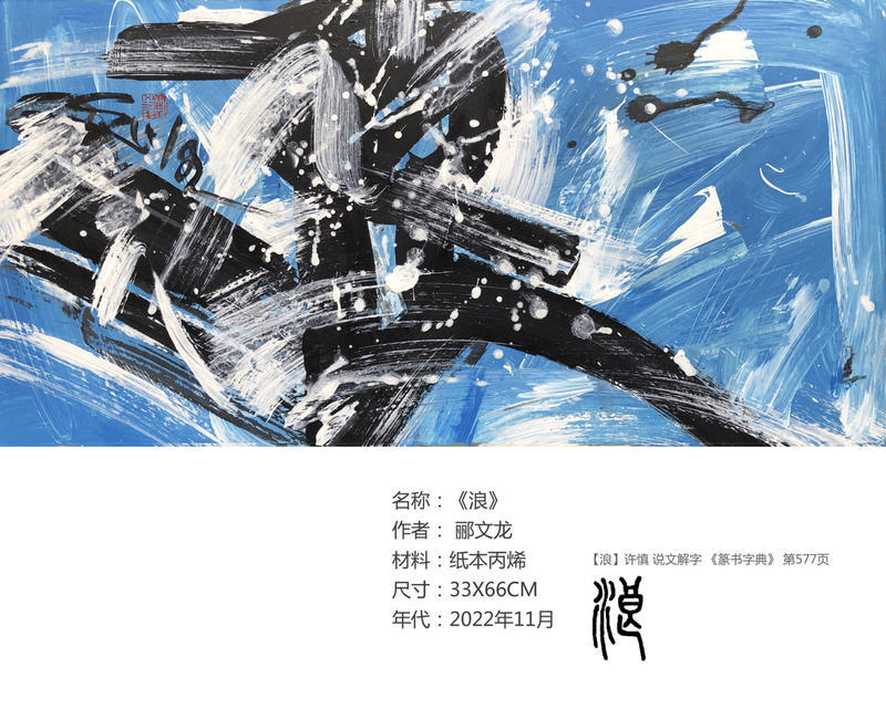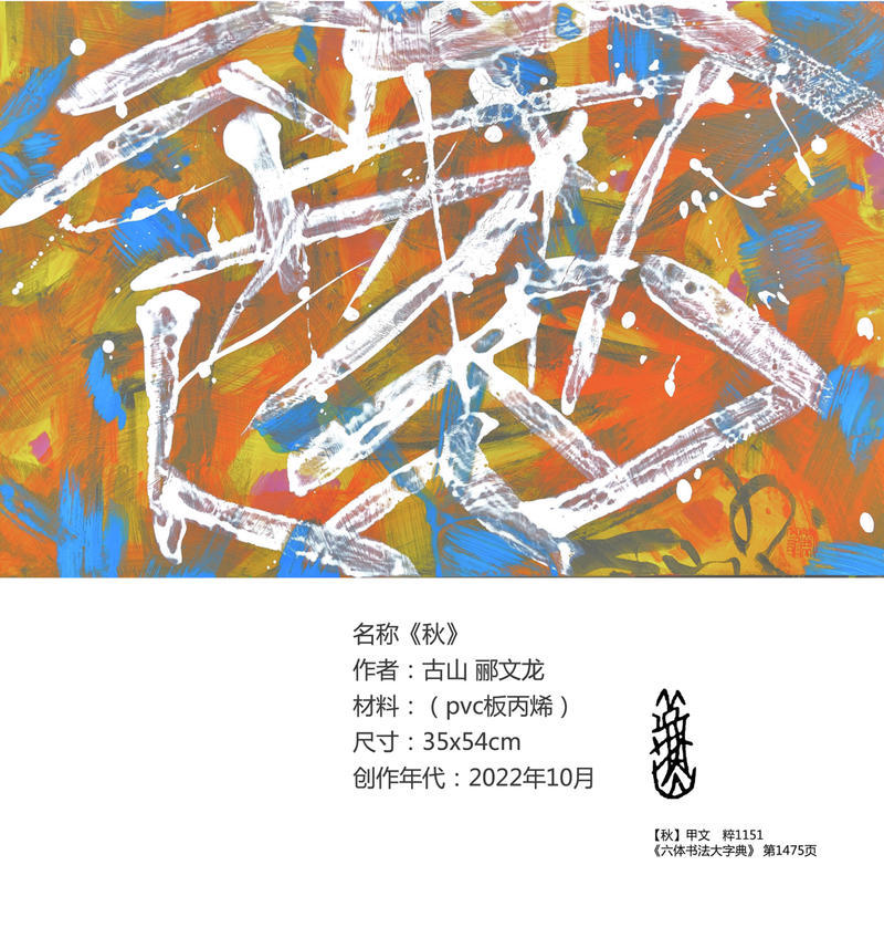 韩天雍(中国美术学院教授、博导、浙江省甲骨文学会会长)评论:郦文龙的"先锋"现代作品,充满着强烈的视觉冲击力,富有力量感,点、线、面相互纠结,多以三角形和重块面表现出冲突与矛盾,又能很好地协调统一在一幅作品中。如民乐中琵琶曲《四面埋伏》、贝多芬的《命运交响曲》,有一种积极进取不被传统书法技法所束缚的奋斗精神,充满着自信与胆魂。 作者选用上古文字即殷商甲骨、两周金文、春秋石鼓或秦代小篆为创作元素,结合他专业的平面设计、色彩构成和立体构成,带有极强的个性语言表达的符号。 我是作为浙江省甲骨文学会会长,郦文龙是我们甲骨文学会的主要干将,可以说是杀出的一匹黑马,他作品的震撼程度令我非常吃惊。有许多作品,像他利用甲骨文中秋天的“秋”字,秋字在甲骨文中的表现是一个蟋蟀,一个很大的蟋蟀,而且是落叶中带有丰富的书写笔意,它的每个点划就像秋风扫落叶那样,又非常有秩序感,但是懂得甲骨文的一看就是个“秋”字,他对每一个文字内容的选择,和他所对应艺术语言的思考每次都不一样,没有雷同。 他用丰富的色彩作为背景和前面的古文字,甲骨文、金文、简帛书、章草之间进行叠加,可以说是非常的丰富。郦文龙先生的作品更多倾向于倾斜、三角、不固定,或者是一种现代年轻人对时代的思考。这里边有一种进步,有一种奋斗,有一种呐喊。总之他有一种很强的震撼力。我感觉这个展览从纸面上的书法到油画布、乃至木板,综合材料的运用,他的色彩的丰富性可以说是㶷烂无比,同时他把古文字的一些基本点划运用到创作中来,又打破了古文字的严谨的相对保守的结构。 他在点、线、面的运用这方面,我感觉他有一种哲学的思考,无论是尼釆哲学、还是叔本华的悲观主义、抑或贡布里希的视觉和错觉这样的图像学,还有阿恩海姆的格式塔心理学。他有很多哲学的、或者美学的一些思考在里面。他不是按照我们原始的、传统的书法理论体系建立起这样的一个阵营。所以这也是西方美学、哲学、带给我们冲击的一个现象,带给我们新的思索。所以,这个现象是有非常好的学术价值。可以视为搞古文字艺术创作的,带有启发性的、带有探索性的具有非同一般的实践意义。