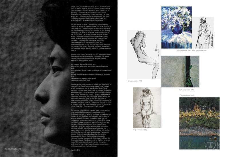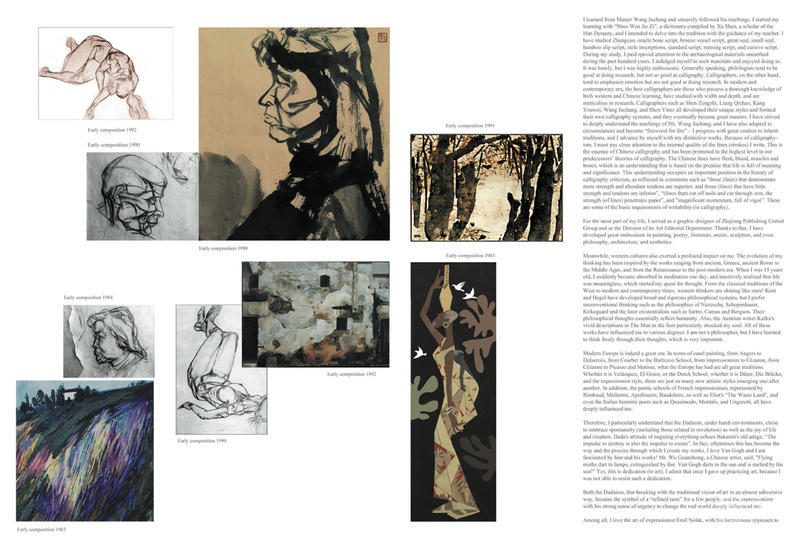 自序 年轻时代的我,不知所措。二十世纪下半叶中国处于改革开放时代。西风东渐,信息爆炸。我沉迷于哲思、文化艺术的目不暇接而眼花瞭乱。因而思维渉及面广且深,从东、西方文艺而言,我有太多的爱好,变的无所适从。什么也做不了。有人说我好高鹜远,可能批评我志向太大,不切实际。然而我很自信,有诗为证: 我早岁孤独 才华无人推许 晚风沉寂 黄叶飘零 可是在我心灵的百花园里 繁花是如此丰盛 以至在狂风暴雨的落花声中 我也自命不凡 当起大诗人 这确实是当时的心情的真实写照。有点言过其实,更重要的是还存有浪漫主义情怀。 然而,我所处时代是一个文化的断层时代,文革后还刚刚恢复高考。百废待兴。十五岁的我已高中毕业,但其时因为知识份子的地位低下,无人关注学识。所处知识越多越反动的黑白颠倒时代。当时,又因为我在知识层面是白板一块,且无书可读,变得记忆力超强。找到一本《水浒英雄传》实在是爱不释手,只怕看完,只能省着慢慢看,而且连续看三遍,完全被书中人物义薄云天的、热爱自由的、英雄主义情怀所折服!居然500页书的情节在脑中串连,可以朗朗背诵,其时还在上高中,教室就变成了我的说书场地,特别是物理、化学课是无人听课,只听我宣讲《水浒英雄传》,所幸的是,此书是中国文学的四大名著之一。 15岁时偏爱书法,开始临摹汉碑,中国字体称“隶书”,由于经济条件差,一度用不起纸张、墨水,只在青砖上用清水练习,后来又阔展到中国绘画,我的创作元素很大一方面来源于中国古文字,这本身是个宏大而神秘变幻的系统,每一发展时期都有鲜明的特色,且承上启下,数千年不绝,运用至今,这确实很神奇。 世界各民族文字可划分为三类,它是音素文字,音节文字,表意文字三大系统。中国的汉字属表意系统,一个汉字代表一定的音节,又具有一定的意义,包含形、音、义三要素。四千多年来,汉字虽经发展变化,但阐递之迹一脉相承!对中华民族的形成和发展起到了巨大的凝聚作用!汉字无所不在,与生活相伴。生生不息,繁茂昌盛!研究汉字艺术,离不开对汉文字的研究,尤其离不开对汉古文字的研究,不然就成无源之水,无本之木。汉字是世界唯一从造字之始沿用至今的文字语言系统。她博大精深,变化万端,其中涉及古文字学,考古学,语言学,文献学、修辞学、书法学等诸多学科。 我所传承的王蘧常先生就是一位学者型书法家,他是文献学家、历史学家、古文字专家、也是经学家和书法家,他传承了中华文明的伟大传统,他的先生们也都是中国近代史上一流的大学者兼书法家。如康有为、梁启超、王国维、沈曾植、唐茹经等等。也由于基因使然,我对他们都是五体投地崇拜!尤其是我的先生王蘧常他以中国文字学为根据,完整的复兴了流行在东西二汉(公元前226—公元220)一种叫章草(从公元581年—公元1900年已废弃不用的书体)的书法体系,这是他一生中伟大工程之一!确实令人叹为观止! 我师从王蘧常先生,谨遵先生教诲,从汉许慎《说文解字》一本汉代学者许慎编辑的字典起始,以先师指点路径前行,意图深入传统。于章草、甲金文、大小篆、简牍、碑版、楷书、行草、均有猎涉!学习中,对近百年来出土的考古材料尤为重视,沈潜其间,乐乎其行。虽寂寞,尤热情。大致而论,文字学家往往精于学、而碍于书。书家倡导、则縦情怀而疏考辩。而近现代书坛之皎皎者则学贯中西,涉猎深广,为学严谨。如沈曾植、梁启超、康有为、王蘧常、沈尹默等均能别开生面、自成体系,成一代宗师!我深会王蘧常先生教诲,亦随缘而化、为火作薪,在传承上履冰前行,在草创上踽踽独行。由于书写主义我必须深切的关注所写线条的内在质量,这是中国式书写的本质问题,在前贤的书学理论中被提升到至高的程度。中国线条是具有血肉筋骨的,它的前置条件是生命是有意义的。在书法批评史中它处于重要的地位。如“多力丰筋者胜,无力无筋者病。”如“斩钉截铁,力透纸背。”如“气势恢宏,八面出峰”。这些都是对于书写性的一般要求。 大多数时候,我是浙江出版联合集团的平面设计师,曾担任美术编辑部主任。效力于官方出版工作。其中绩效考核、升职考核,外语考核、竞争上岗费去了大部分精力!在三十二年的设计师生涯中,最大好处是思想活跃,学习积极,所以似乎显得视野开阔!有强烈的比较主义倾向。在绘画,诗歌、文学、音乐、雕刻、乃至哲学、建筑、美学都有极大的兴趣和爱好!工作之余,阅书甚多。 另一方面西方文化也深刻的影响也了我。从古希腊、古罗马,到中世纪,从文艺复兴到后现代都启迪着我的思想演进。15岁的我,某一天忽然凝神静思,直觉到生命是无意义的,开启了我的思想追寻之旅。从西方的古典传统、乃至近现代,西方思想家灿若群星,熠熠生辉!康德、黑格尓体系博大严谨,但我更喜好剑走偏锋的思辩,尼釆、叔本华,雅思贝尓斯,克尓凯廓尓、和其后的存在主义萨特、加谬、或是伯特兰·罗索、伯格森、贡布里希等……这些思想在本质上都是人本主义的体现,尤其象奥地作家卡夫卡他的《套中人》文笔的深刻描绘,造成我灵魂上的震撼,都不同程度的影响了我。我不是哲学家,但通过他们的思想,我学会了自由的思辯,这非常重要。 近现代的欧洲确实是一个伟大的时代,架上绘画从安格尔到德拉克洛瓦,从库尔贝到巴比松画派,从