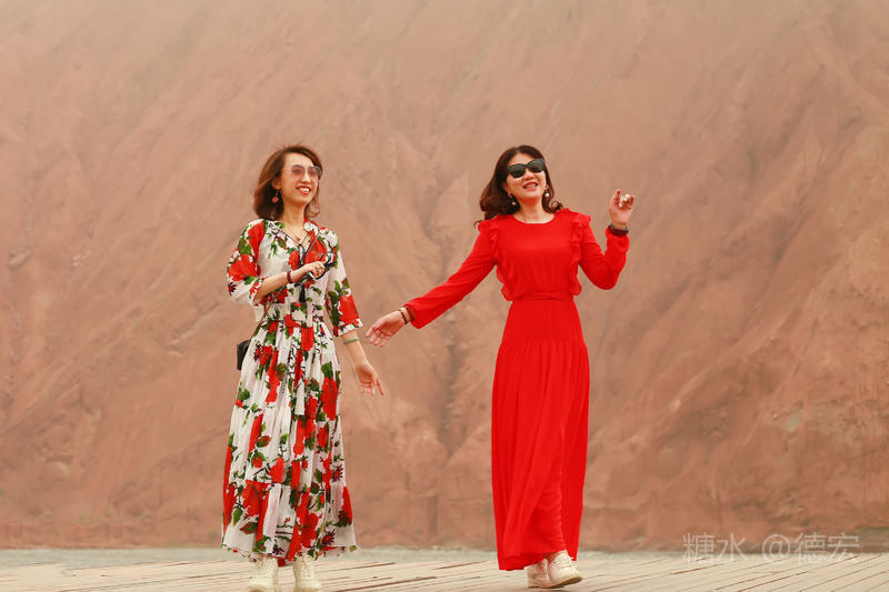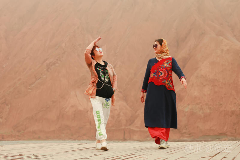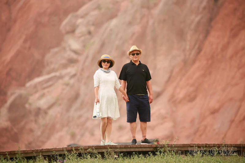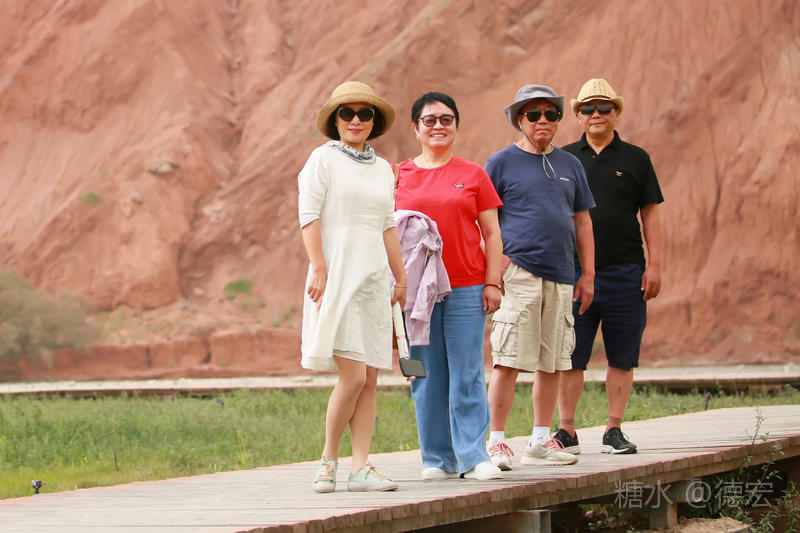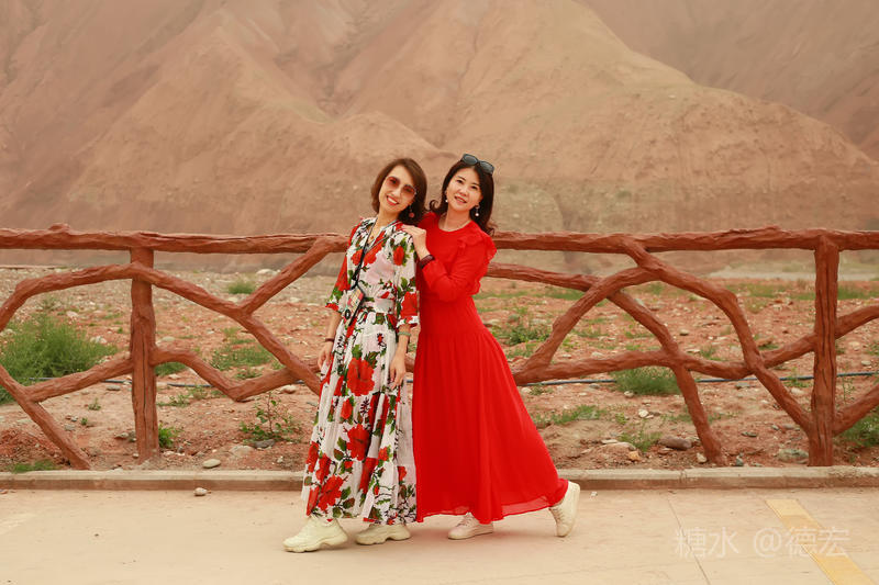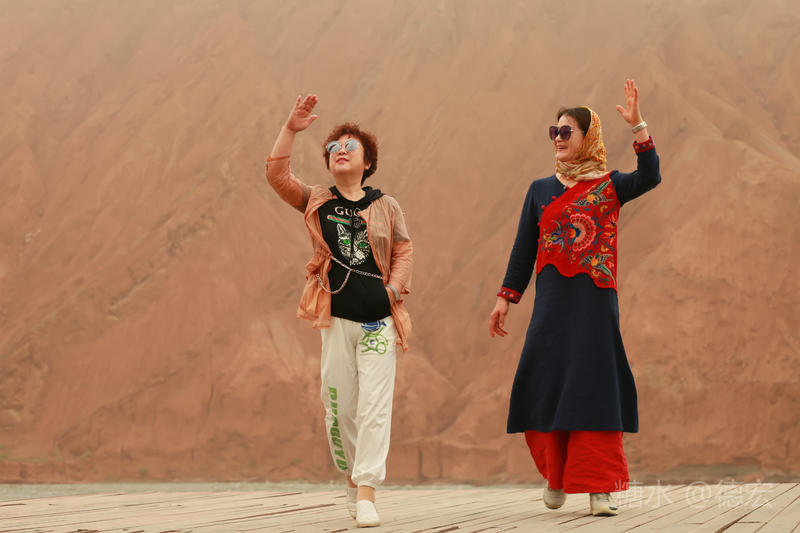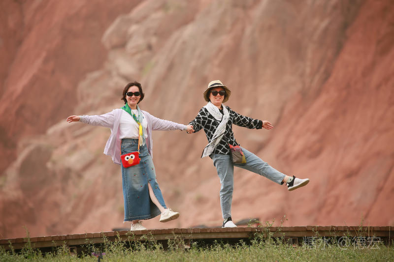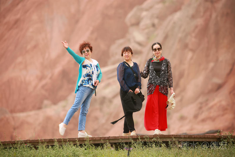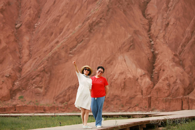 穿过大门约五十米远有一条木质栈道,栈道的尽头是一片火红色的山体,依靠在河谷边,绵延一公里多,如果是晴朗朗的天,这个色彩会比吐鲁番的火焰山更鲜艳。