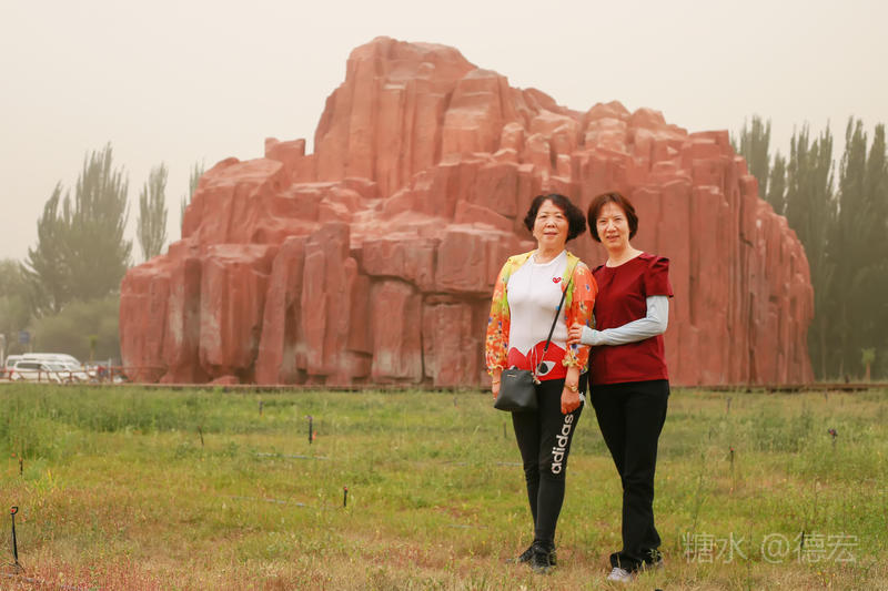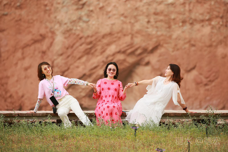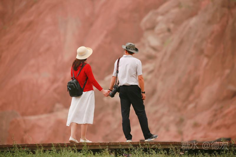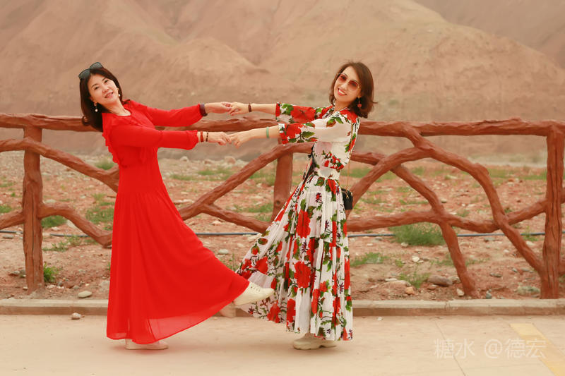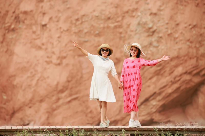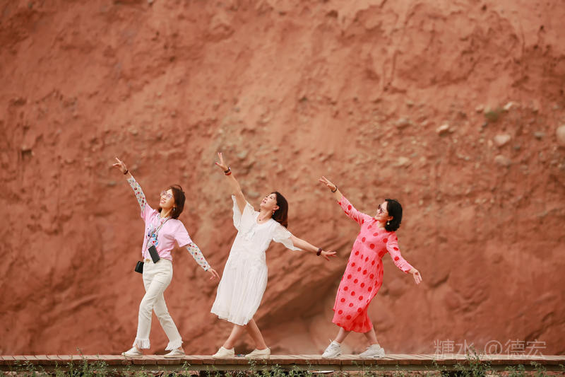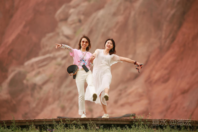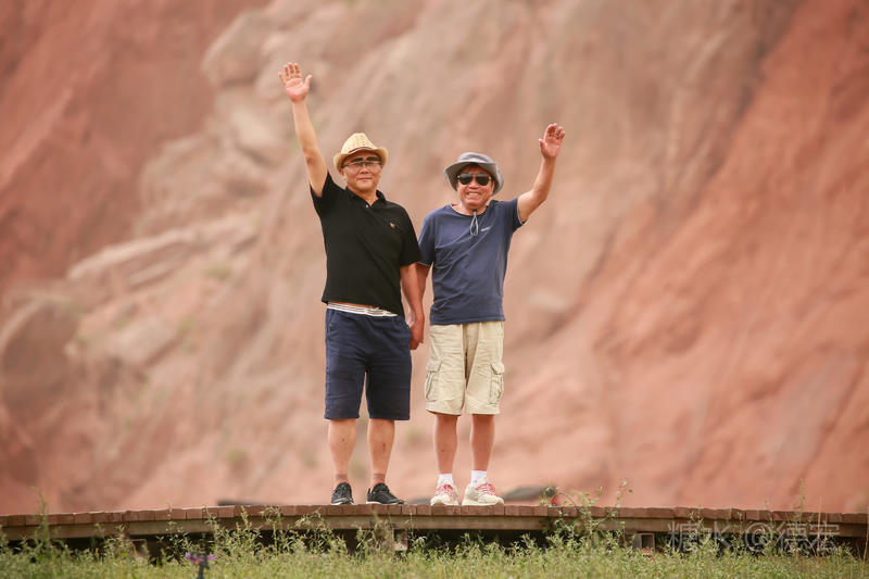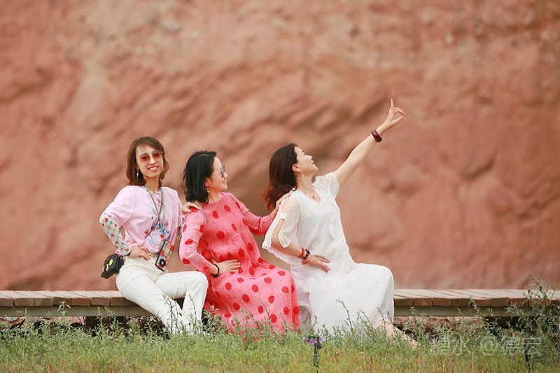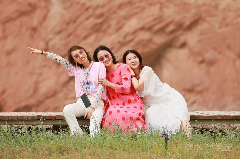 穿过大门约五十米远有一条木质栈道,栈道的尽头是一片火红色的山体,依靠在河谷边,绵延一公里多,如果是晴朗朗的天,这个色彩会比吐鲁番的火焰山更鲜艳。