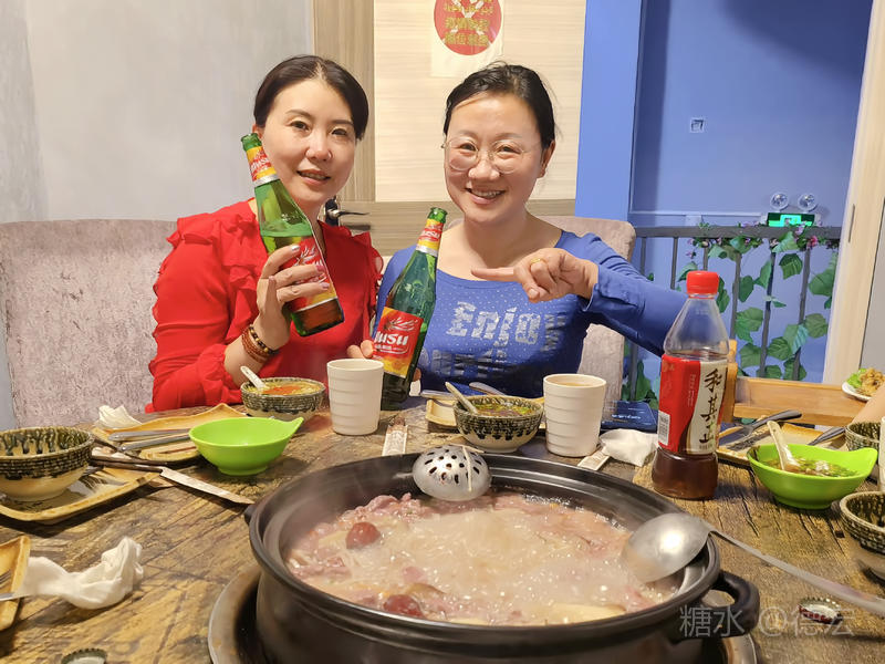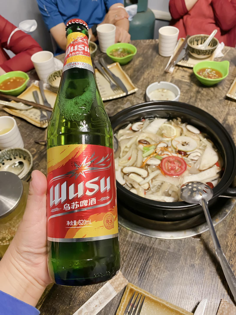 第一次吃牦牛肉火锅,喝着新疆的大乌苏,两盘牦牛肉,酒足饭饱,精神愉快。