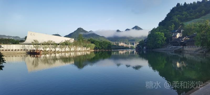 清晨的边城是一座静谧安详的乡村,清澈见底的清水河缓缓流经古镇,两岸的房屋分别所属三个不同的省,这边的茶峒镇归属湖南,对面是重庆洪安镇,右前方是贵州的迓驾镇。