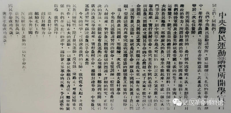 《开学宣言》中明确:武昌农讲所的使命,是训练能领导农村革命的人才,号召广大的农民群众起来,实行农村革命,推翻封建势力。