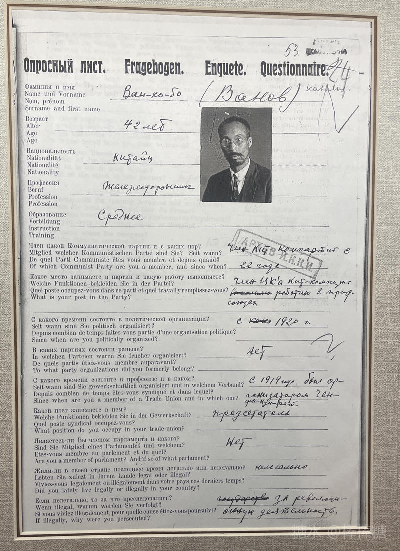 出席共产国际五大的中共代表王荷波的登记材料 ,原件藏于俄罗斯国家社会政治历史档案馆(南京有王荷波纪念馆)