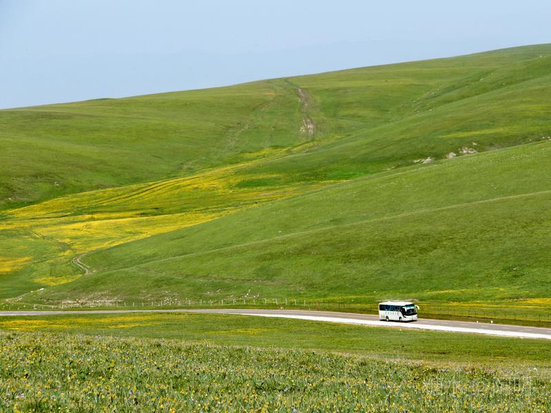我们选了全域游喀拉峻常规线路,在景区门口乘坐景交车,一路上车下车不亦乐乎,从:石泉→鲜花台→猎鹰台→喀拉峻索道站(午餐)→库尔台索道站→鳄鱼湾→阔克苏大峡谷→九曲十八弯→人体草原→库尔台码头(游船)→库什塔依码头→游客中心(扎布拉克)!