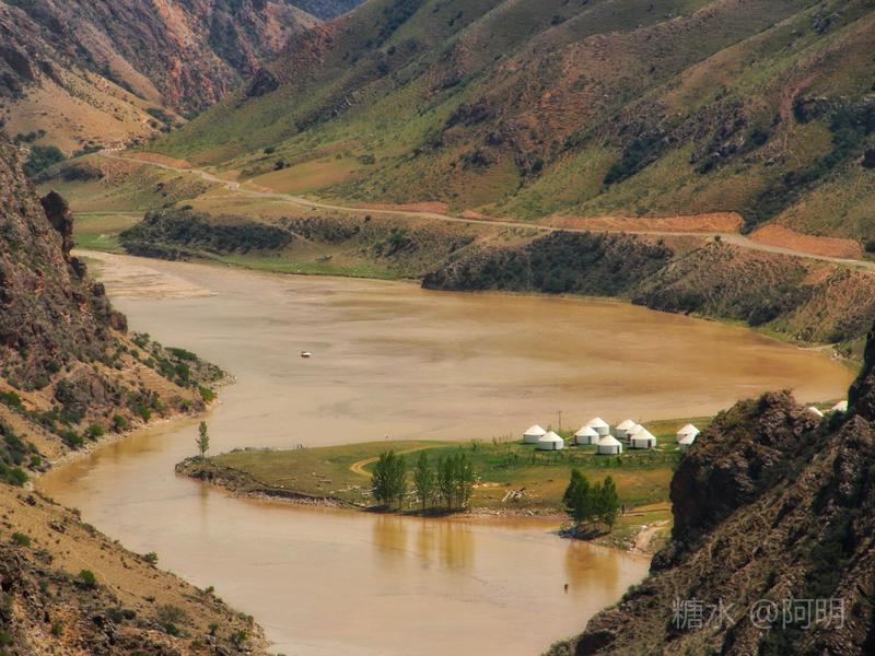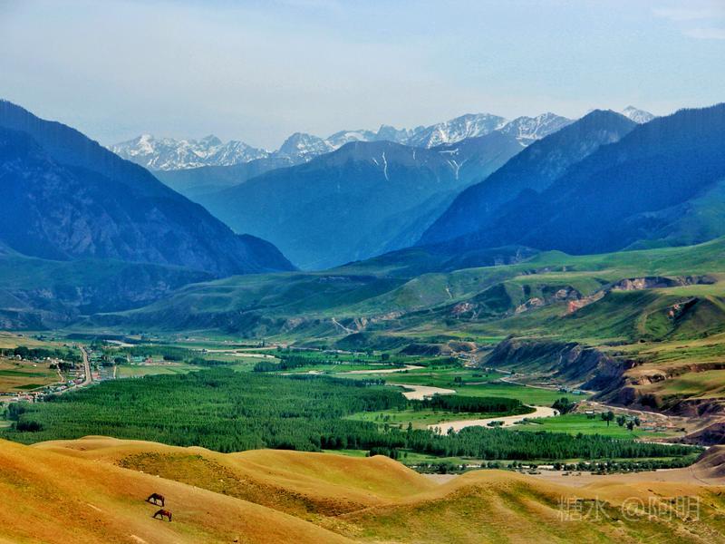 这里群山环绕,山峦重叠,谷间河水平缓,波光荡漾,河湾植被郁郁葱葱,炊烟和着林间轻雾,牧民的毡房若隐若现点缀其间,一派壮美而又不失旖旎的峡谷草甸风光。