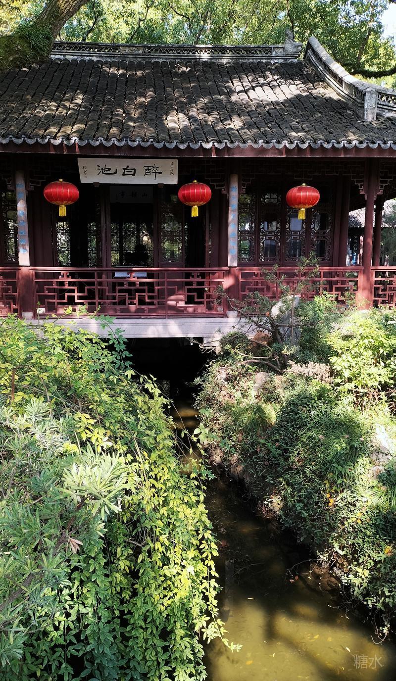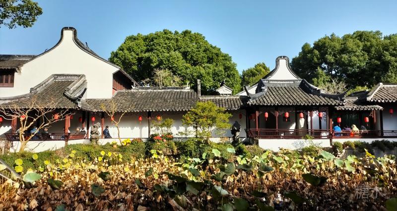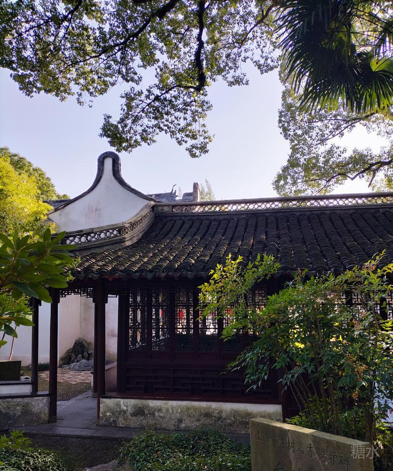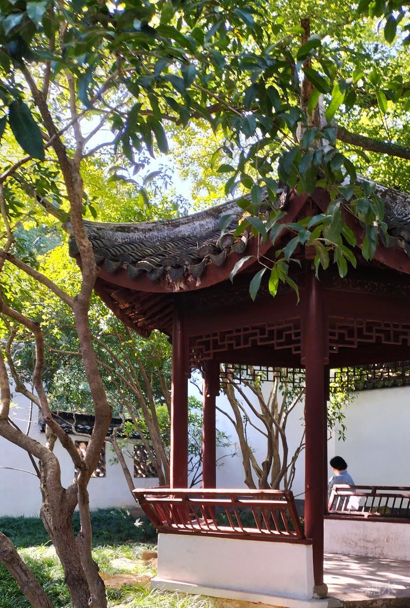 内园醉白池, 是整座公园的精华所在。 以一泓碧水为中心, 环池三面皆有曲廊亭榭。 依水而筑,曲径通幽, 无论晴雨均可凭栏赏景。 此时的醉白池, 池内荷花繁华落尽, 摇曳的残荷依然风韵犹在。 园内小桥流水,亭台楼阁, 古树、竹林、假山一应俱全。