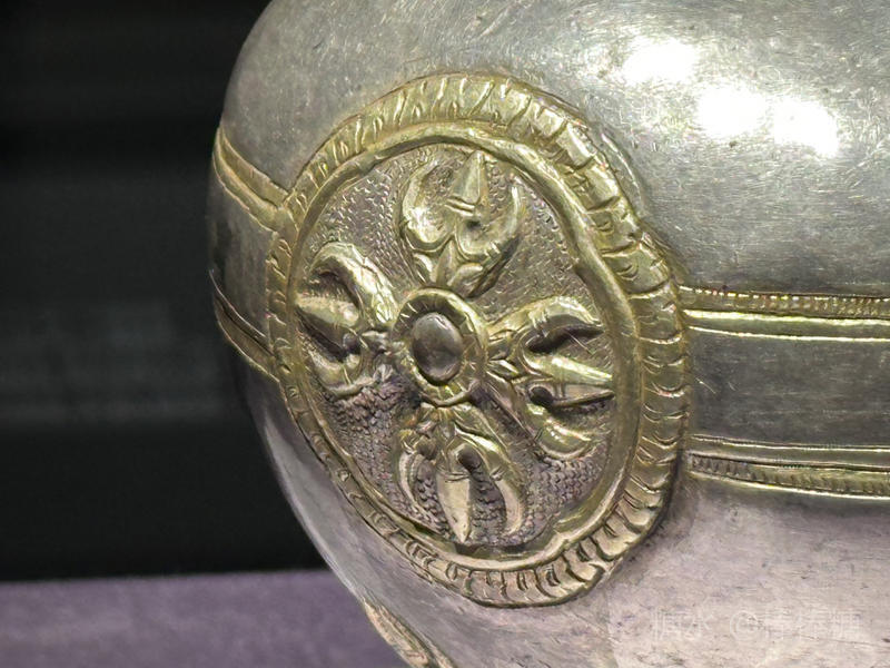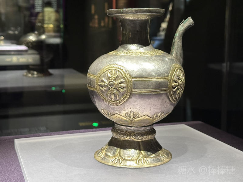 这件银阏伽瓶钣金成型,纹饰鎏金。瓶底墨书“北”。