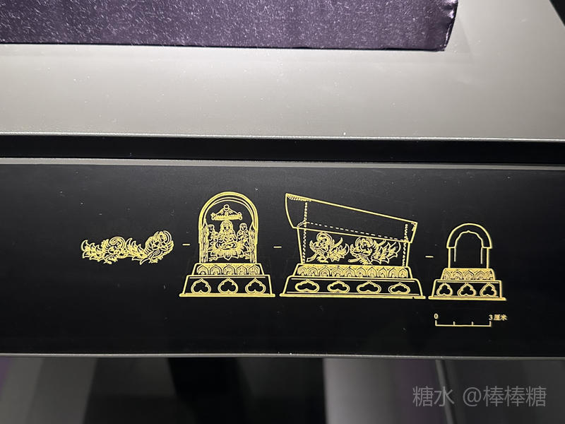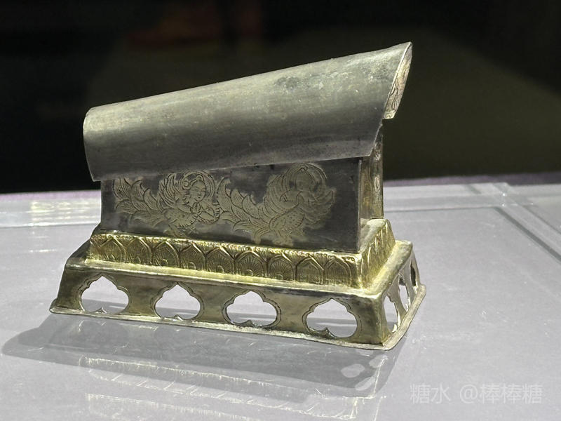 棺体两边各錾刻鎏金迦陵频伽鸟2只,前档錾刻有一佛二弟子。