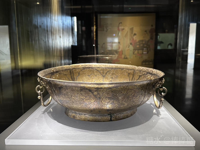 此盆集浇铸、模冲、捶揲(ye)、錾刻、鎏金、铆接等多种制作工艺于一体。盆底錾一对以鸳鸯为中心的阔叶石榴大团花。盆外两侧铆接两个前额刻“王”形纹样的天龙铺首,口衔海棠花圆环,环上套接弓形提。