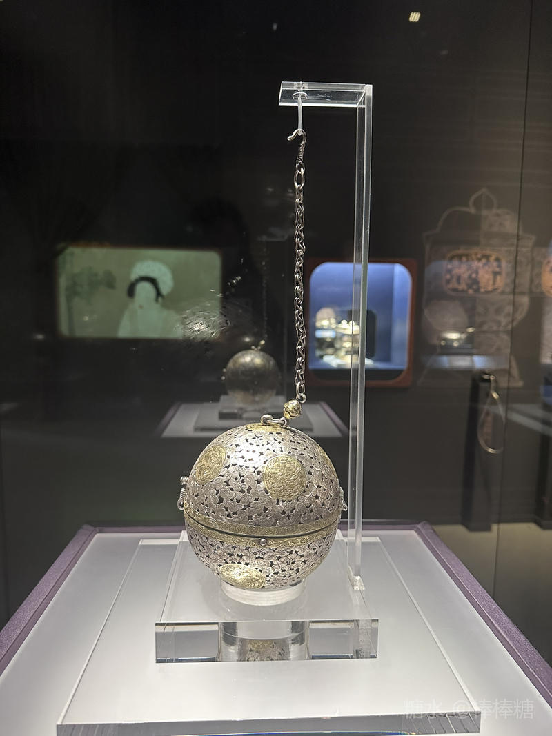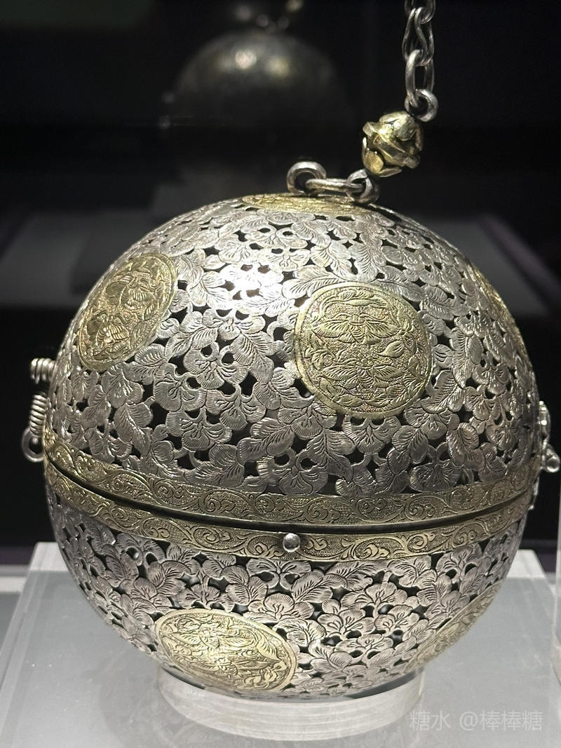香囊内部装有平衡装置,设有内、外机环,连接香盂。圆球滚动时内、外机环也随之转动,香盂的重心始终保持水平不变。