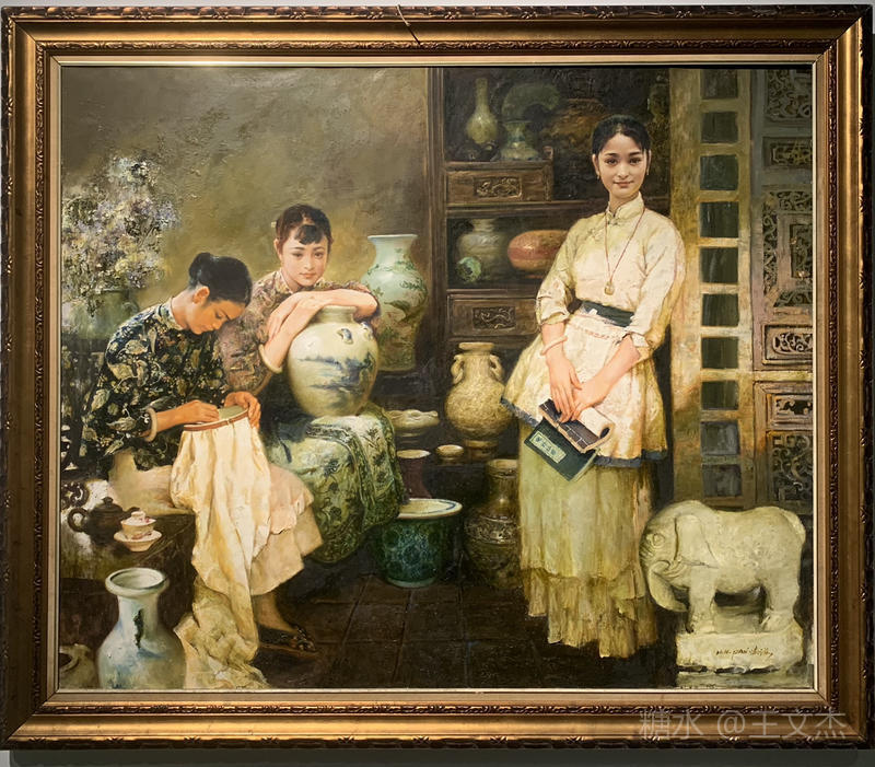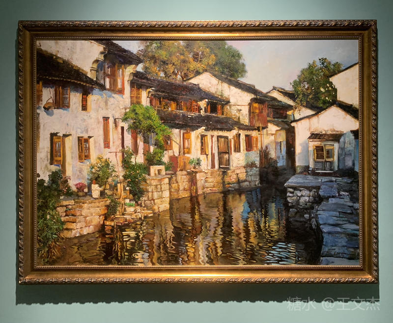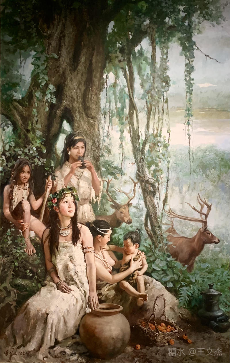 “风景旧曾谙,潘鸿海油画艺术展”展厅中给我印象最深的是集其江南水乡油画之大成的《玉馨良渚》这幅巨作。这是潘鸿海与汪文斌在2008年应“中华五千年——百年追梦”主题创作工程而合作创作的三联油画作品,由潘鸿海领衔构思的创作成果。作品以三联画的构图组织方式,展现了5000年前,良渚先人生活与仪式的恢宏场景。史诗般的场面注入了画家浪漫主义的大胆想象和现实主义的历史情愫,把“史前”人类水乡泽国的“美丽洲”描摹成江南富饶繁华的“伊甸园”,从而再现出“东方文明的曙光”,以及美好清丽与富饶繁华的江南。三联组画呈波浪式的高低起伏,构图富有有节奏,体现了原始人类刀耕火种的“日常生活”和敬天礼地的“宗教仪式”这两大主题。