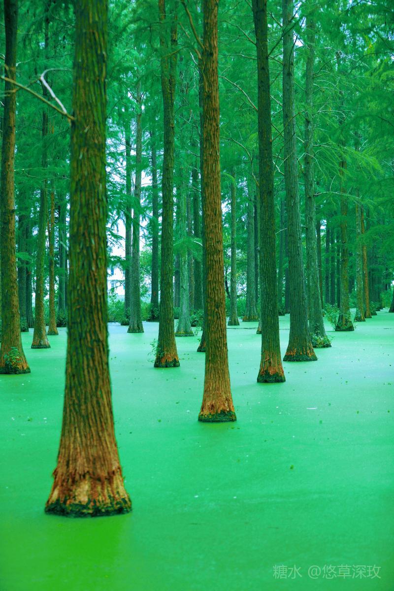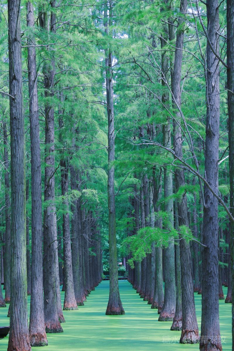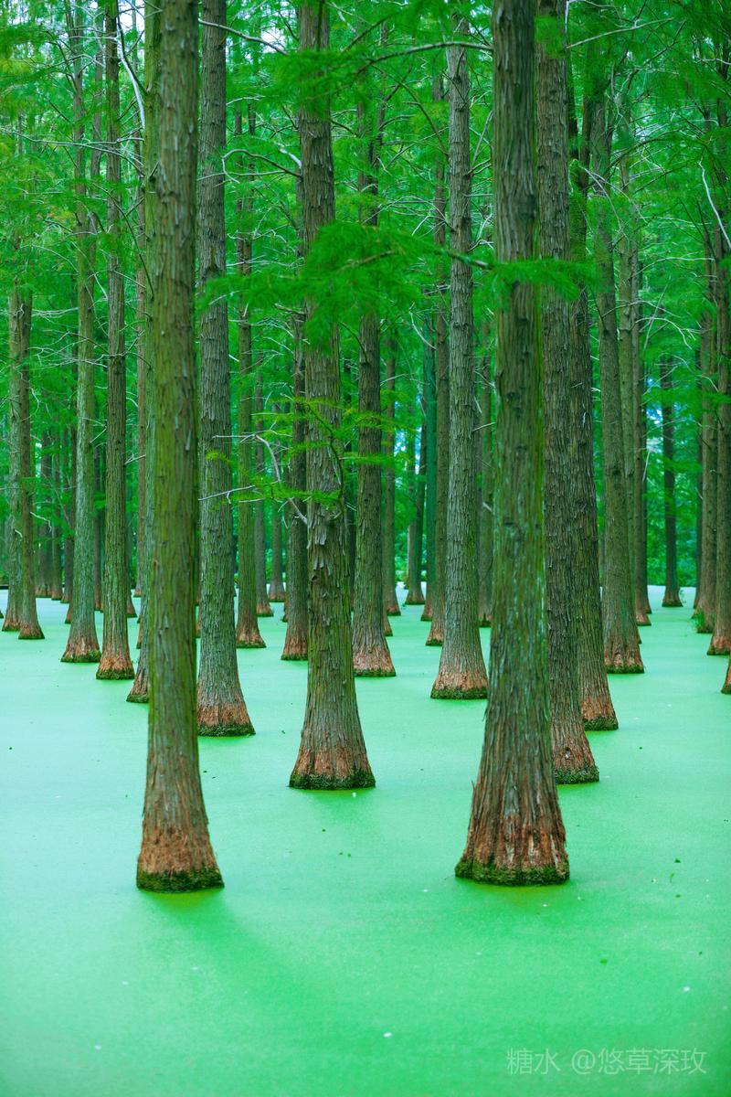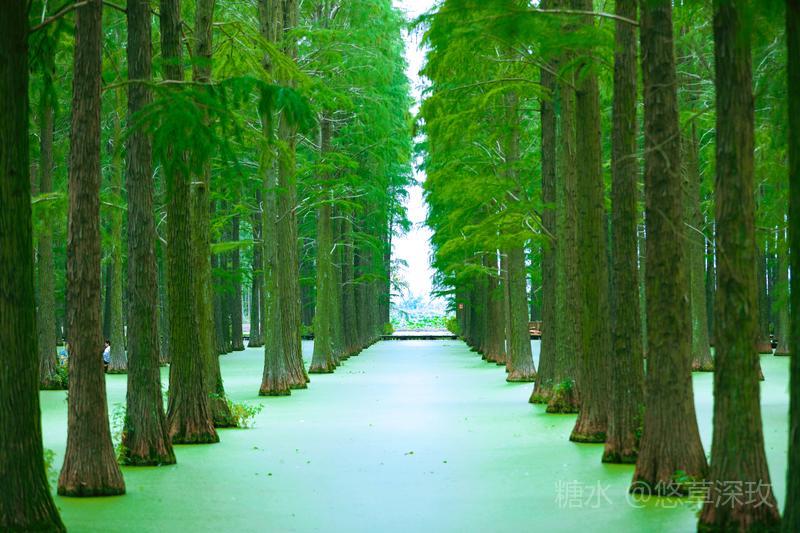 湿地内的“水上森林”是渌洋湖别样的风情,株株池杉伫立,在水面上留下美丽的倒影。郁郁葱葱的杉林,绿叶蔽天,水面上铺满浮萍,就像抹茶一般,宛如一帧绿色的油画。