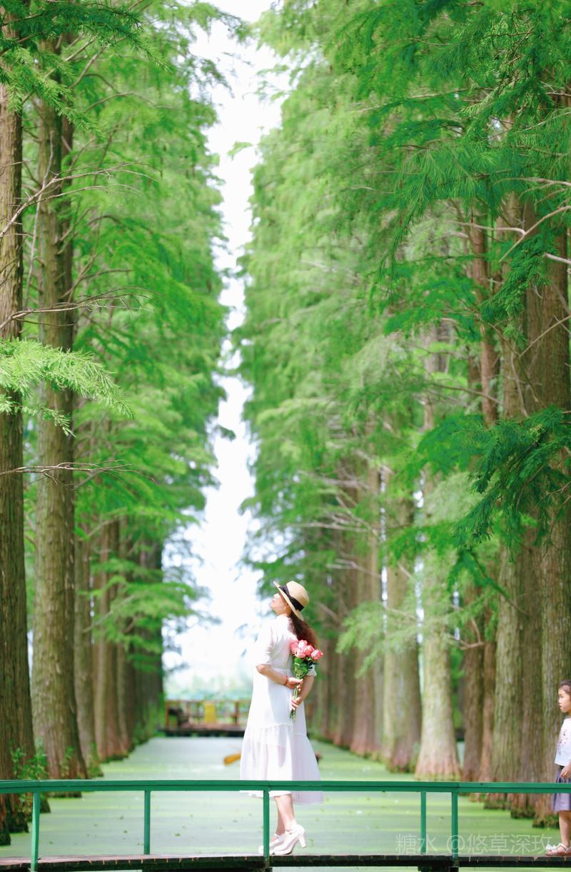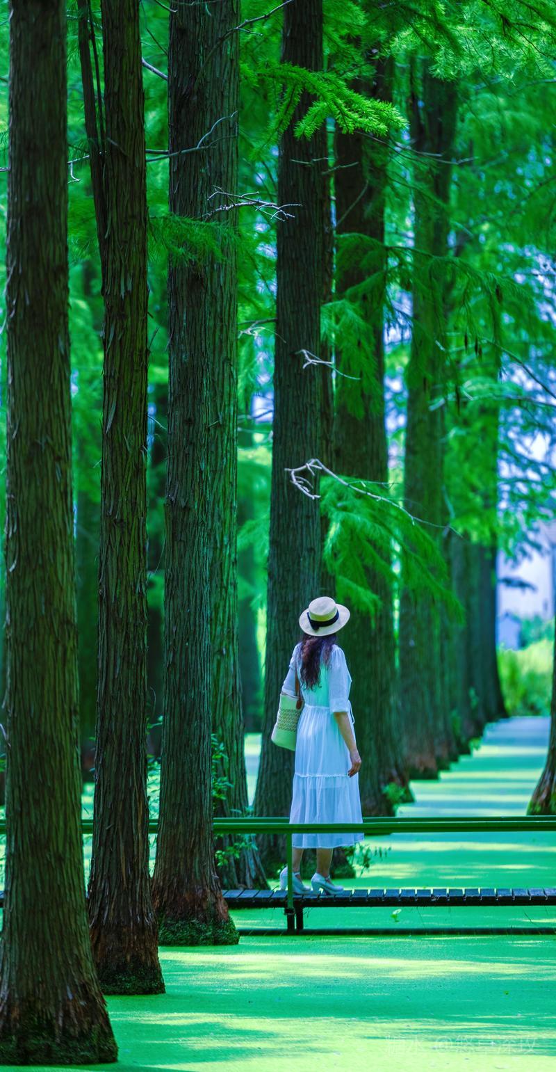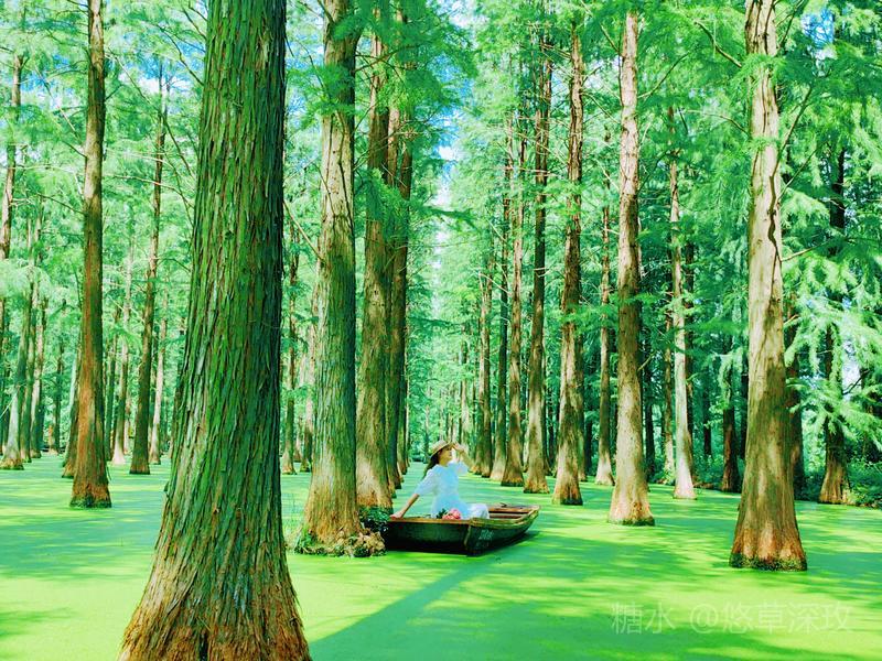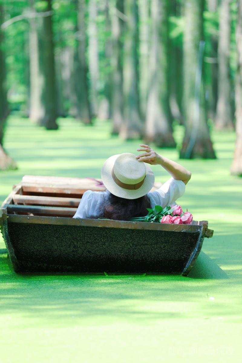 小舟在绿野中行驶,栈桥如星轨,绿洋湖是奔向童活的彩虹,游于绿色斑驳的水衫船在林中走 ,人在画中游整个场景美如仙境林中,拨开了一层层翠绿的轻纱。