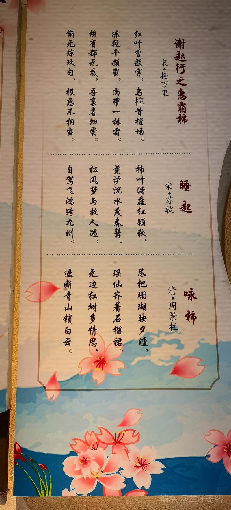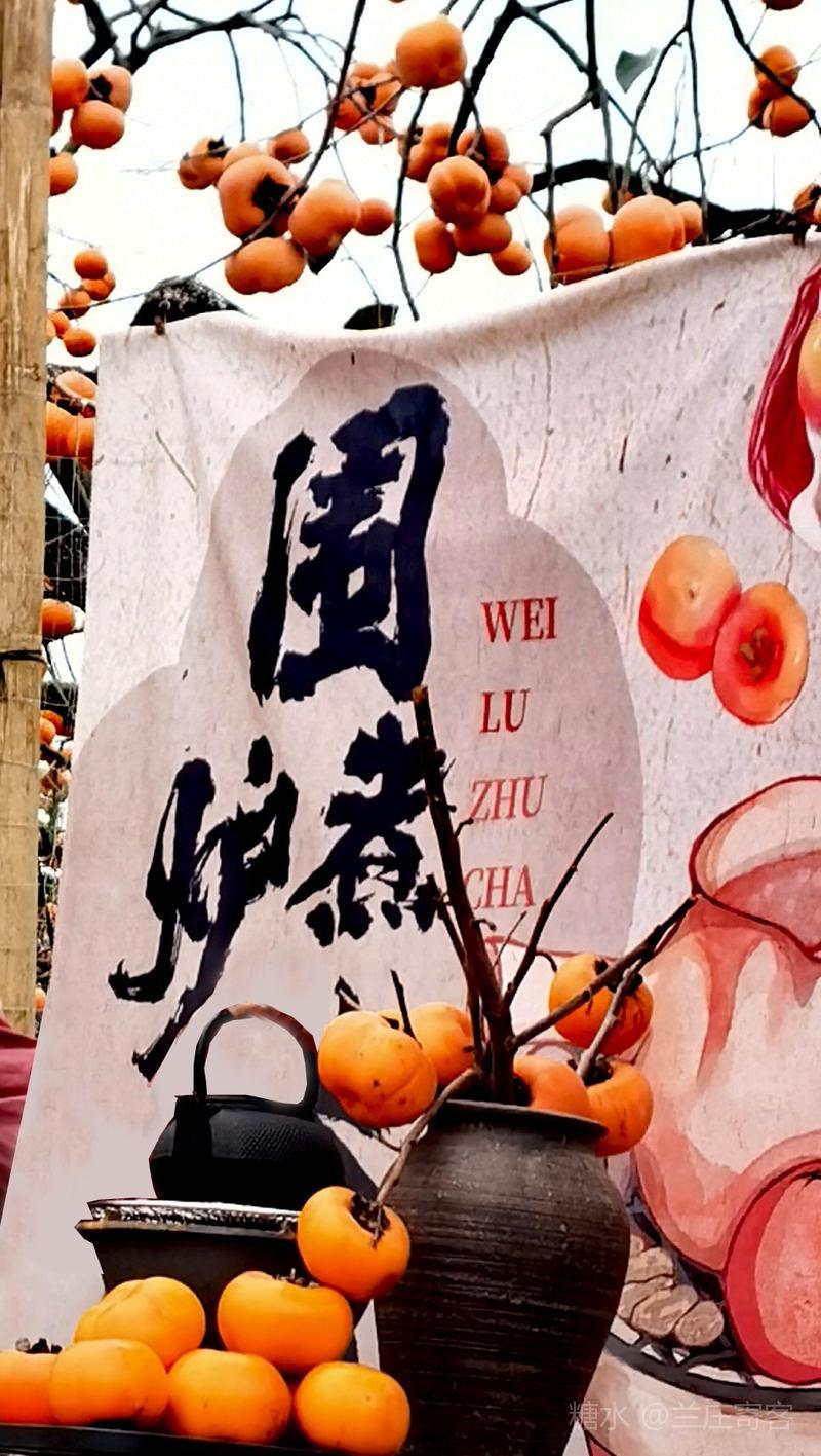 (二)、游园忽见“围炉煮茶”的背景广告墙、美女柿园抚弦雕塑和“我在等风,也在等你”等网红佳句,特步韵宋代苏轼《睡起》欣作题图诗。 七绝·无题 文/兰庄寄客 天涯望断又三秋,总任残香笼静篝。 煮茗听风孤月伴,飞鸿何日过琼州? 《睡起》 宋·苏轼 柿叶满庭红颗秋,薰炉沉水度春篝。 松风梦与故人遇,自驾飞鸿跨九州。