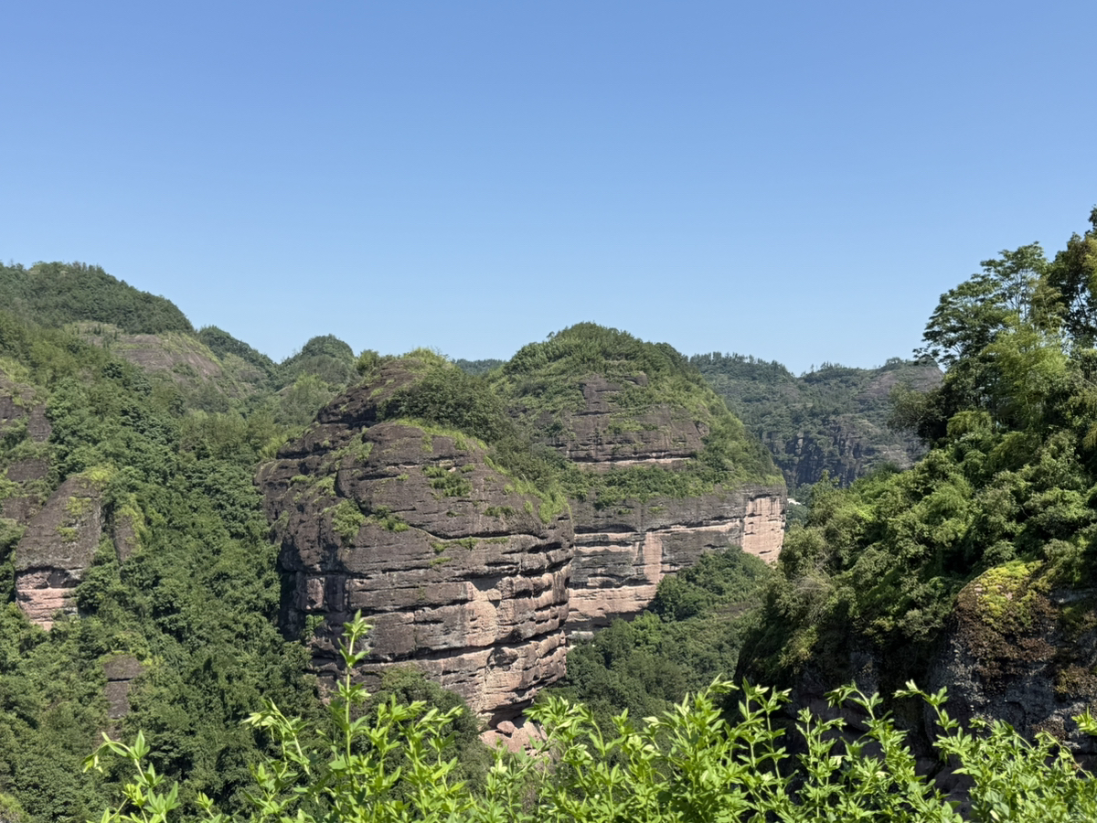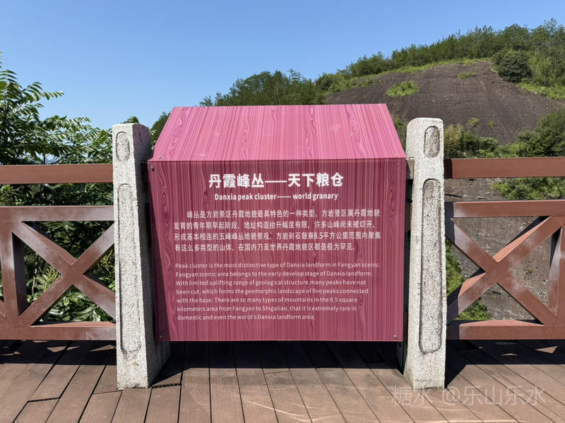 近处一座横跨峡谷的“天桥”,把方岩南北景区连接起来。站在“天桥”上遥望左前方几座拔地而起、巨大的圆柱体山石,仿佛是几座宏大的粮仓,储备着千万吨粮食,这些山石被形象地称为“天下粮仓”。