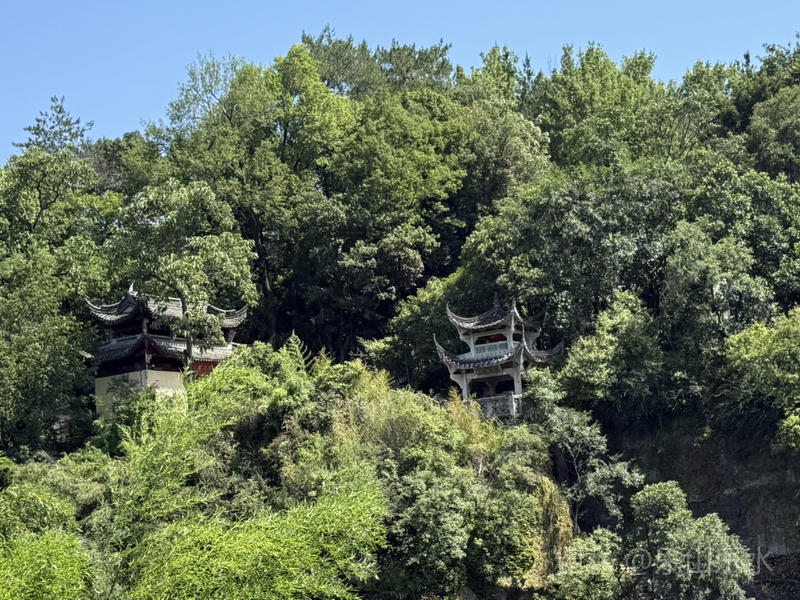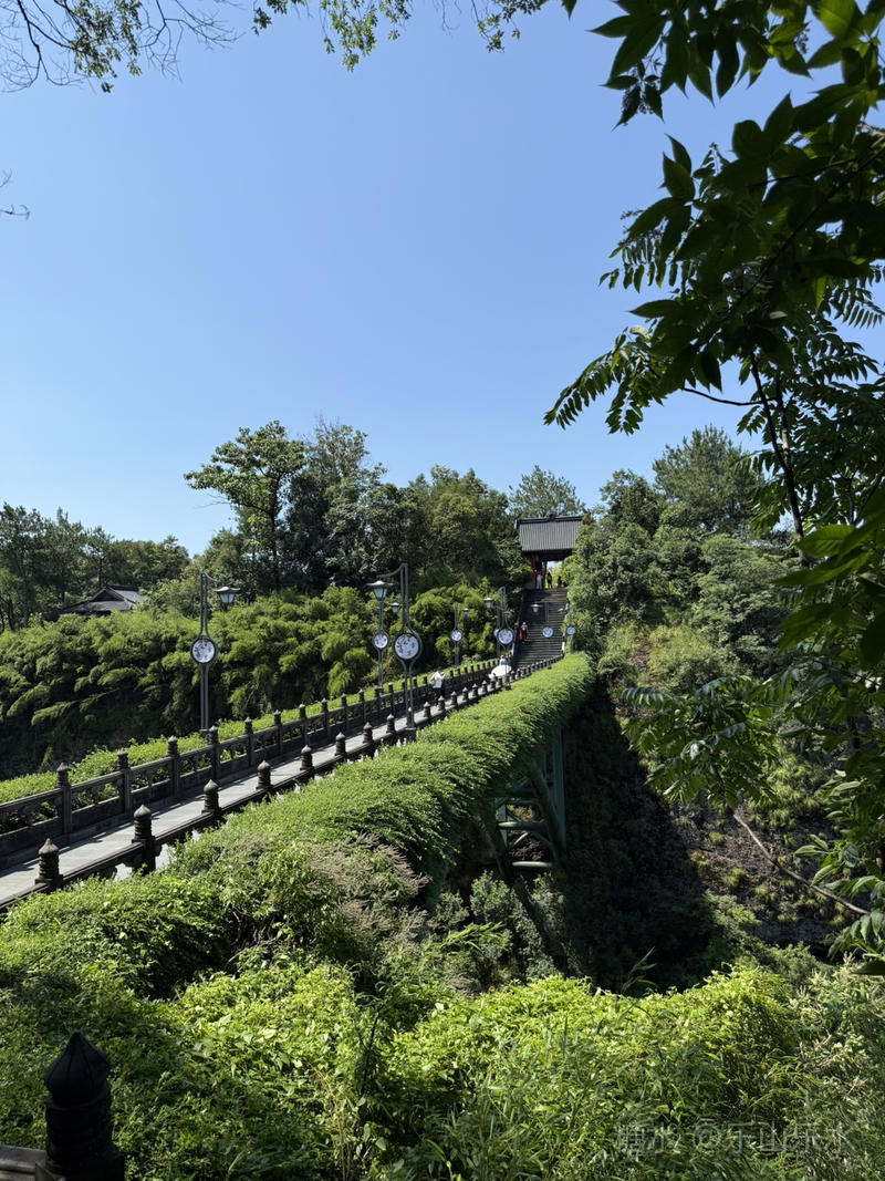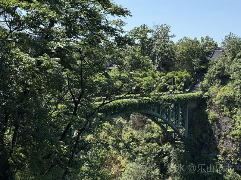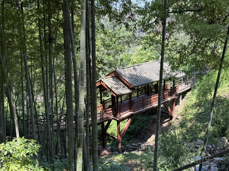 步入“天街”,古木参天,遮阴蔽日,曲径通幽,藤萝绕径,石苔侵阶。密林深处,楼阁隐隐,路旁一侧,山溪蜿蜒,溪流潺潺,气温一下子降了下来,让人仿佛来到了一处清凉的世界里。