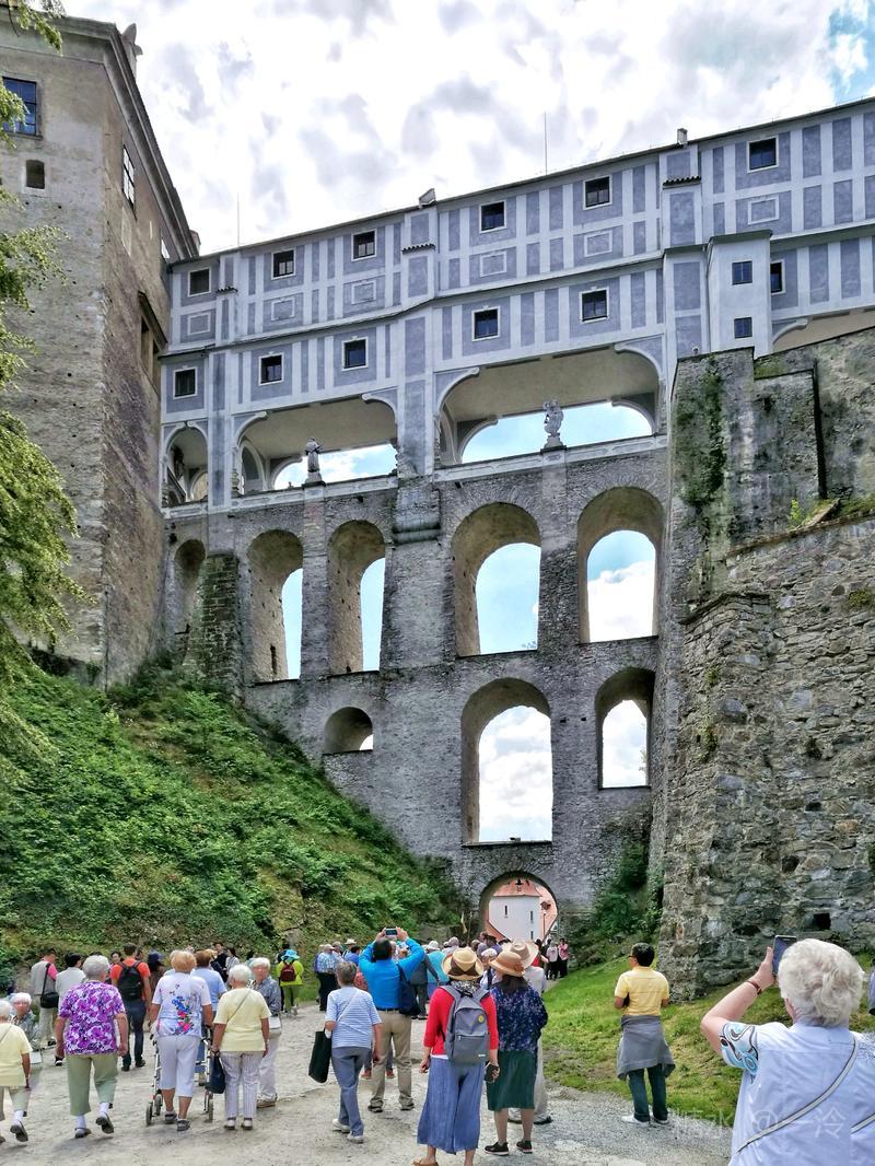 在伏尔塔瓦河畔仰望克鲁姆洛夫城堡,能感到一种震撼力和美感。城堡建于13世纪,后又经过陆续扩建,成为融合多种风格的大型建筑群,其规模仅次于首都布拉格城堡。